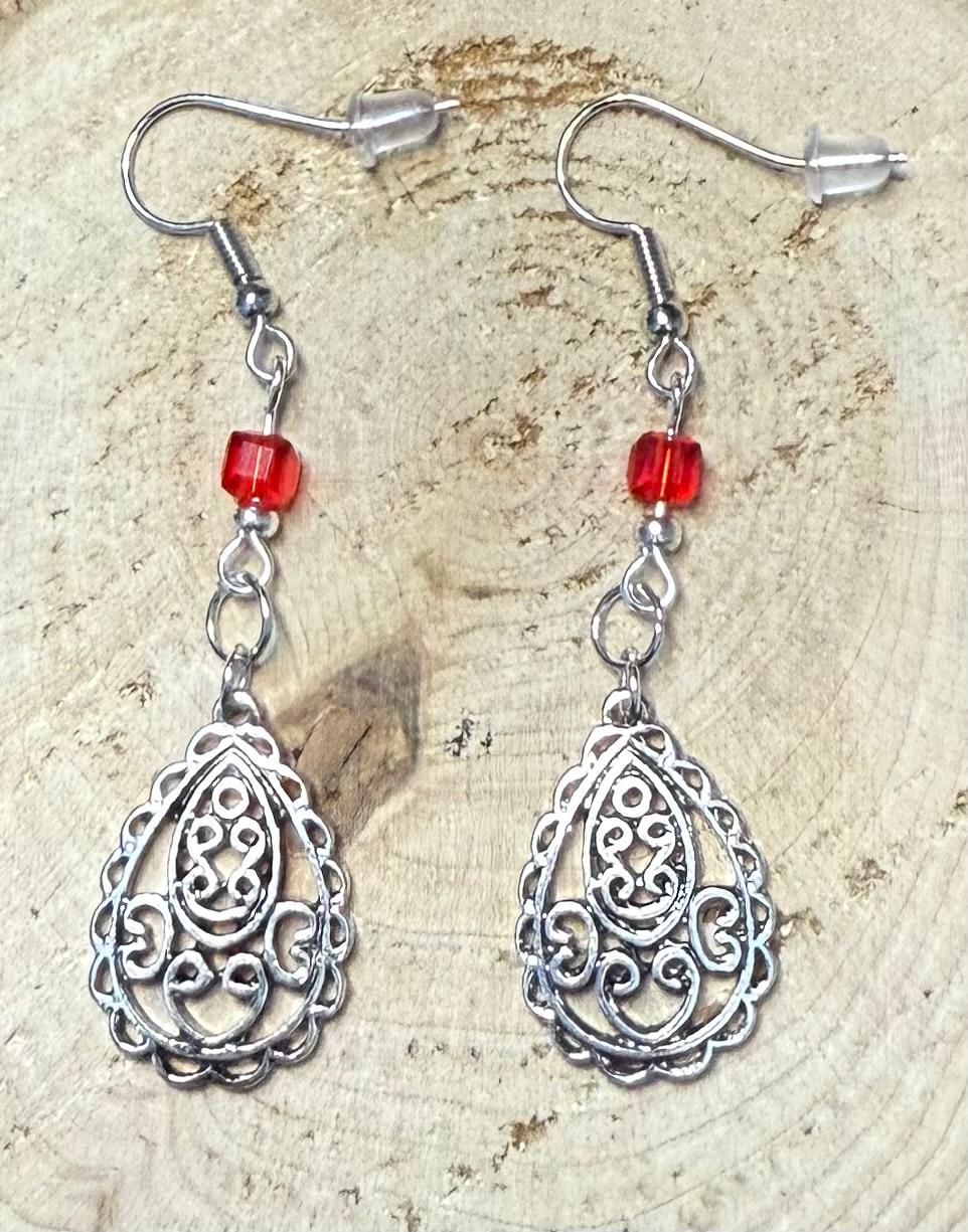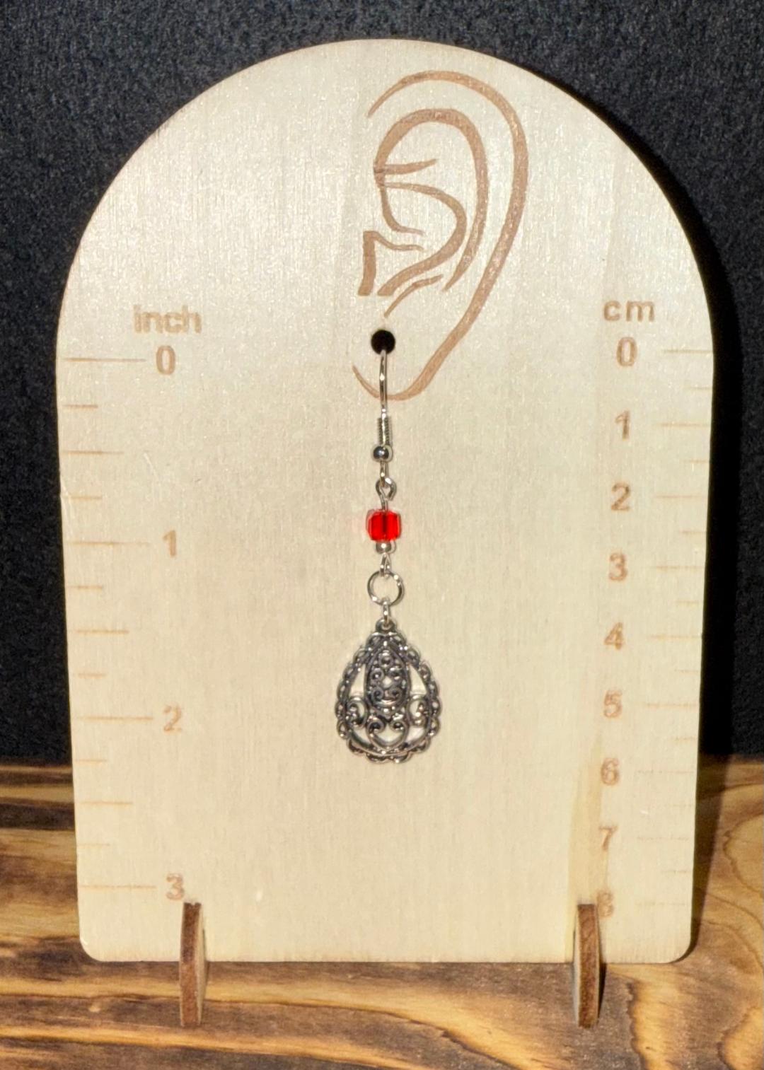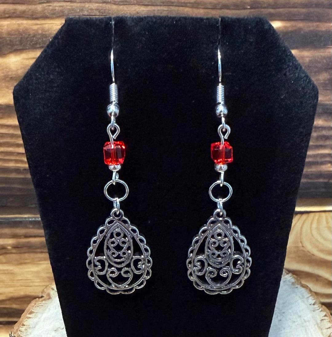 |  | Item #: 1005946 Click on image to see more pictures! A cute Bohemian style silver metal alloy teardrop shaped lotus charm. It is topped with a square glass red bead and made with nickel free earring hooks. Measurement Questions? Price: 14.00 |