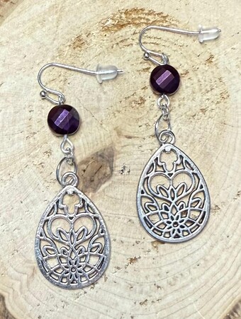 ![]() | Item #: 1005947 Click on image to see more pictures! A Boho style teardrop lotus silver metal alloy charm topped with a glass faceted plum color bead. Made with nickel free earring hooks. Measurement Questions? Price: 14.00 |