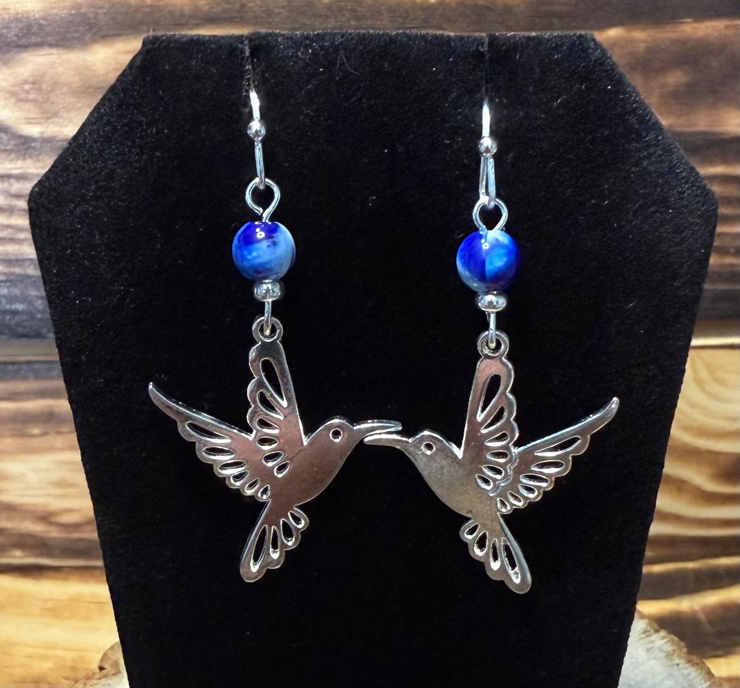 NEW SILVER PEACE DOVE & BLUE GLASS TIE DYE BEAD EARRINGS