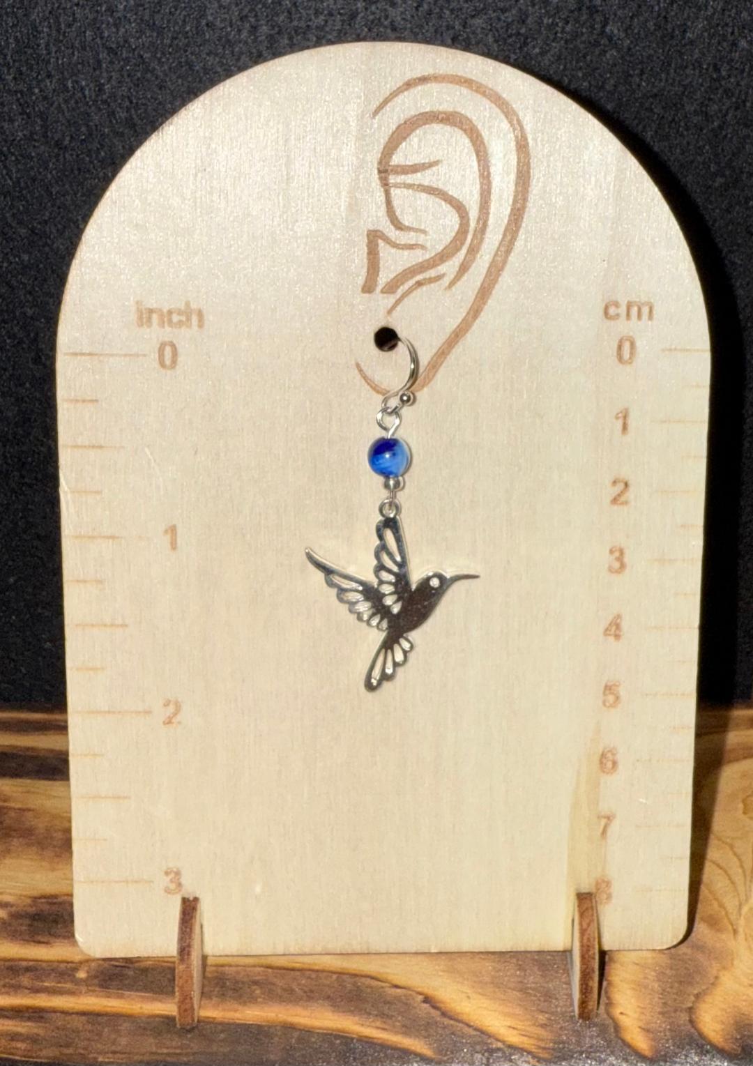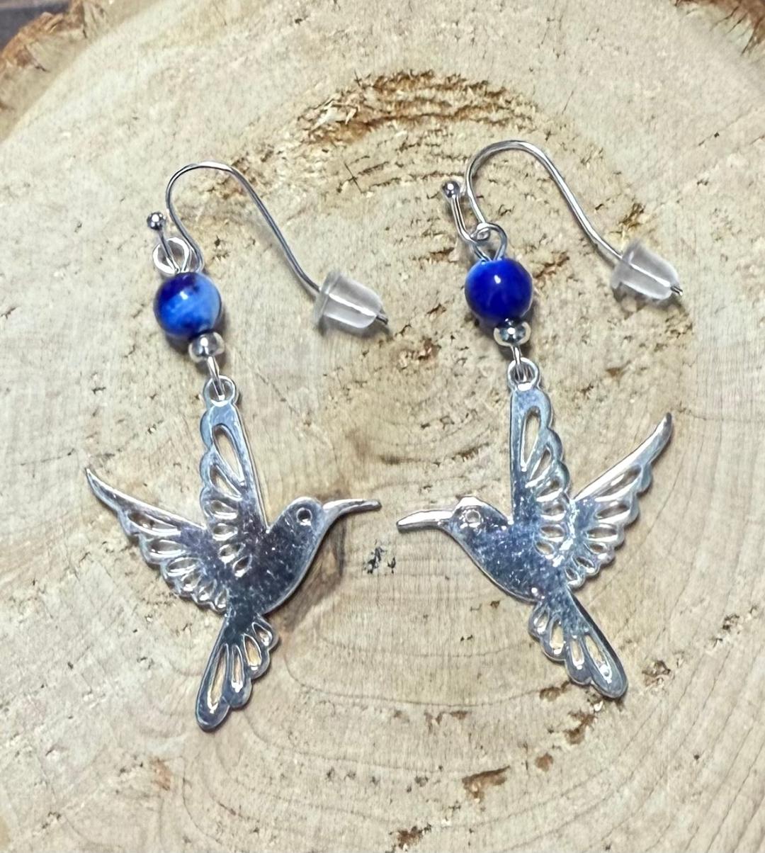 |  | Item #: 1005957 Click on image to see more pictures! A cute little peace dove in silver metal alloy, topped with a glass blue & white tie dye style bead. Made with nickel free earring hooks. Measurement Questions? Price: 12.00 |