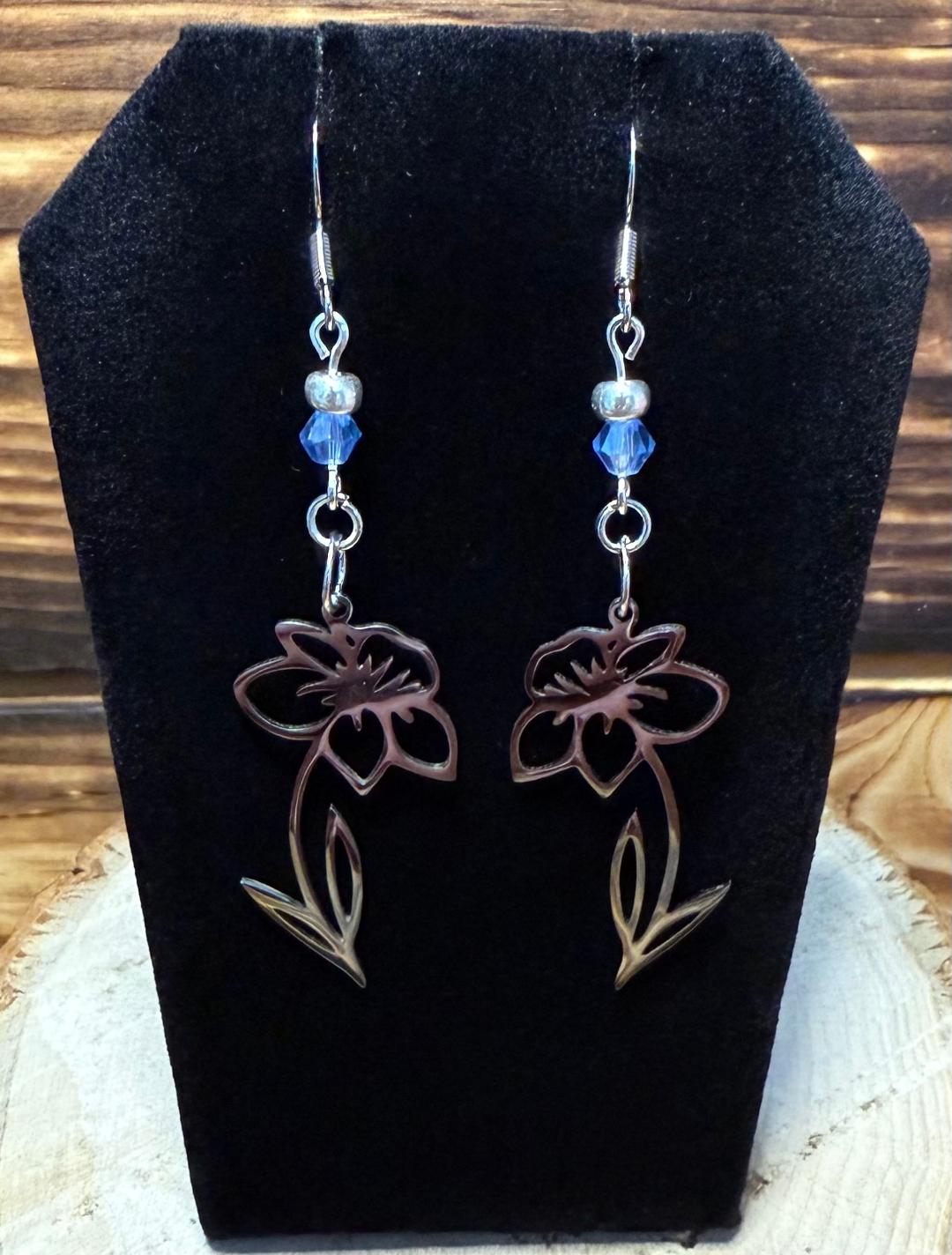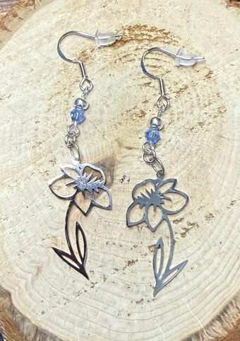 |  | Item #: 1005963 Click on image to see more pictures! A shiny hollow single flower charm in silver stainless steel, topped with baby blue faceted beads. Made with nickel free hooks. Measurement Questions? Price: 15.00 |