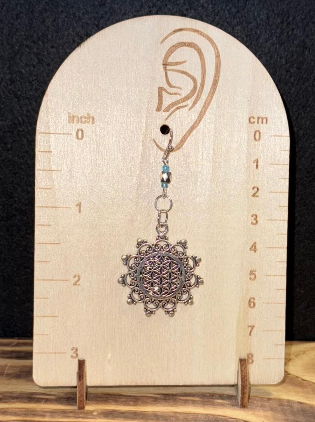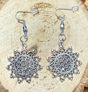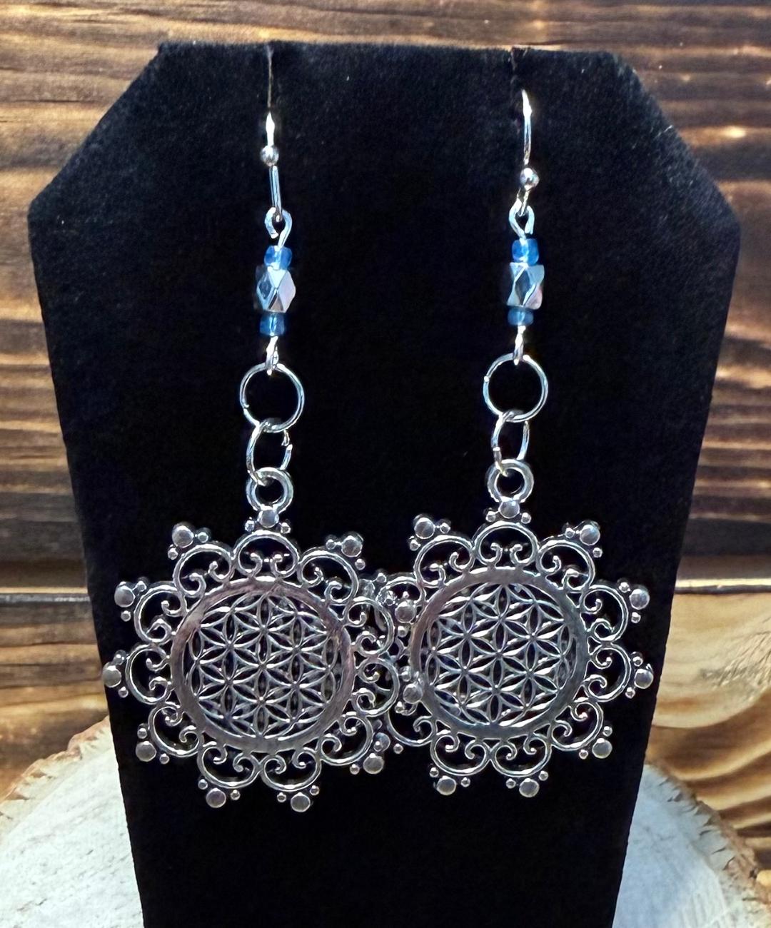 NEW ROUND MANDALA ALLOY CHARMS W/ SILVER & BLUE BEAD EARRINGS