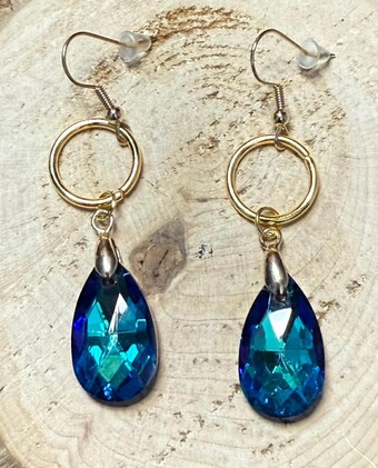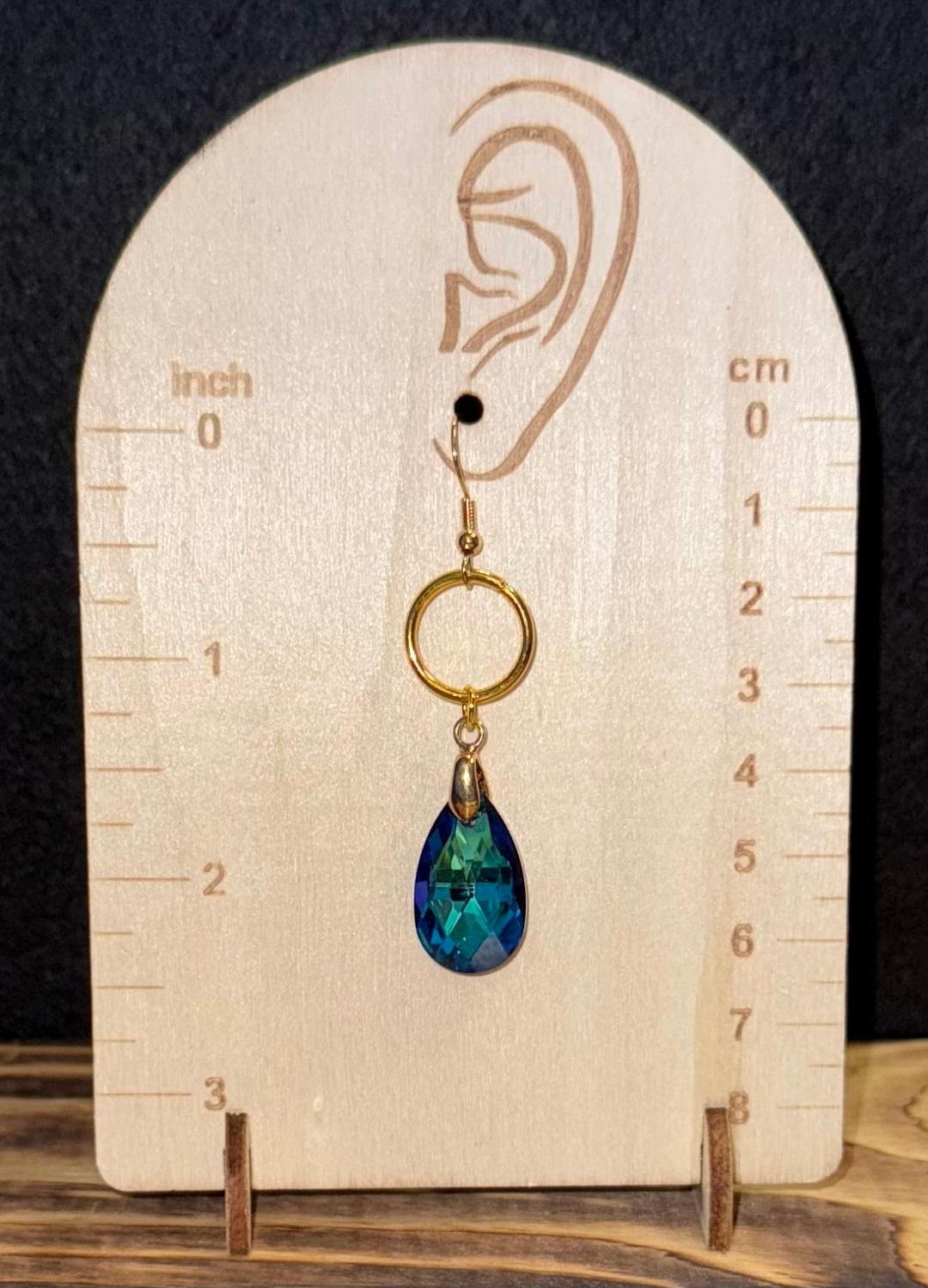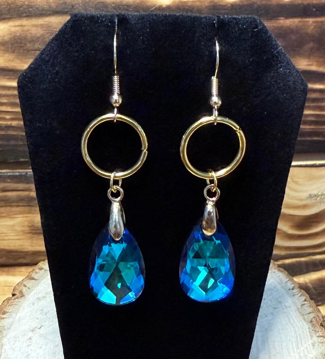 ![]() | Item #: 1005968 Click on image to see more pictures! Made with a vibrant ocean blue faceted drop stone and topped with a large circular jump ring and made with nickel free earring hooks. Measurement Questions? Price: 14.00 |