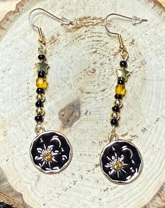 ![]()  | Item #: 1005972 Click on image to see more pictures! A mystic style pair of earrings focusing on a circle charm with a raised sun & moon. They are topped with a line of beading that include an amber glass bead, a star shaped gold tone bead and various seed beads. Made with nickel free earring hooks. Measurement Questions? Price: 16.00  |