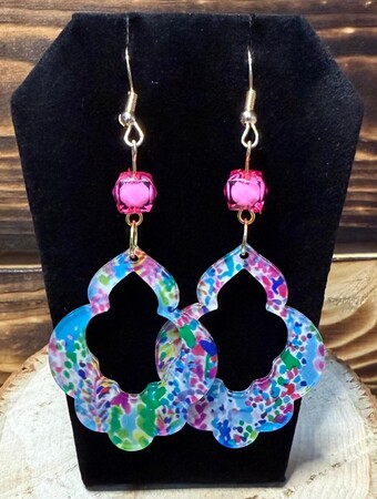 NEW ACRYLIC POLYCHROME GEOMETRIC EARRINGS W/ HOT PINK BEAD