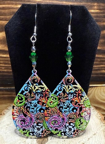 ![]()  | Item #: 1005989 Click on image to see more pictures! A thin pair of hollow cut metal large teardrop earrings that are painted in vibrant colors, plain teal blue back. There is also a faceted green bead dangling from the bottom. Made with nickel free earring hooks. Measurement Questions? Price: 17.00  |