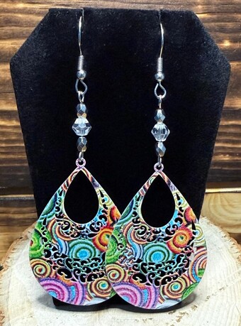 ![]()  | Item #: 1005991 Click on image to see more pictures! A thin pair of hollow cut metal large teardrop earrings with an open center, that are painted in vibrant colors, plain teal blue back. It is topped with beads, including a faceted clear bead. Made with nickel free earring hooks. Measurement Questions? Price: 17.00  |