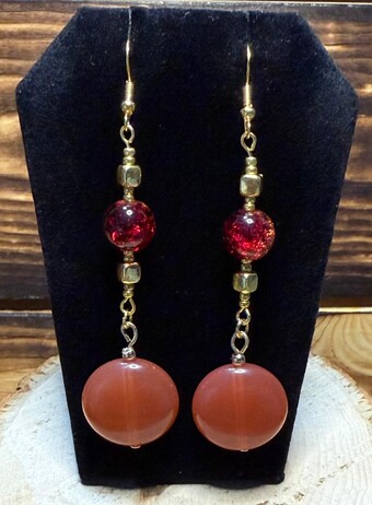 |  | Item #: 1006018 Click on image to see more pictures! A contemporary pair of earrings made with a shiny round orange resin charm, topped with a round dyed orange cracked glass bead and smaller square gold tone beads. Made with nickel free earring hooks. Measurement Questions? Price: 14.00 |