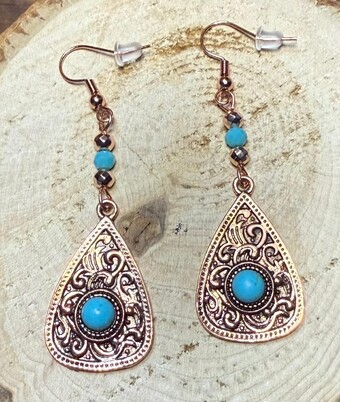 ![]() | Item #: 1006025 Click on image to see more pictures! A very pretty Boho pair of rose gold metal alloy earrings, decorated with faux turquoise faceted beading, as well as rose gold seed beads. Made with nickel free earring hooks. Measurement Questions? Price: 18.00 |