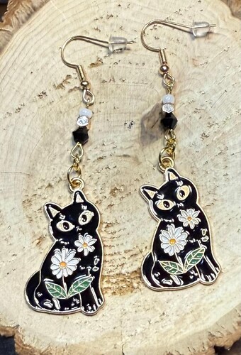 ![]()  | Item #: 1006086 Click on image to see more pictures! A sweet kitty cat charm, metal or zinc alloy, painted in enamel with darling eyes and white daisy flowers on her body. The charms are topped with beading. Made with nickel free earring hooks. Measurement Questions? Price: 15.00  |