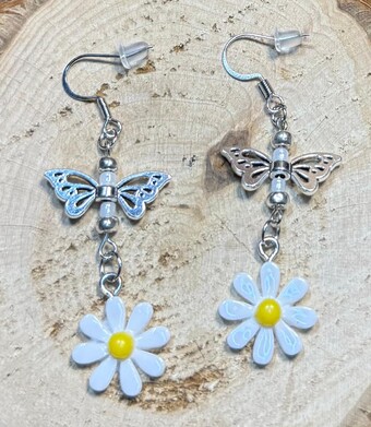 ![]() | Item #: 1006087 Click on image to see more pictures! Made from light plastic white daisy charms and topped with butterfly wings and beading. Made with nickel free earring hooks. Measurement Questions? Price: 11.00 |