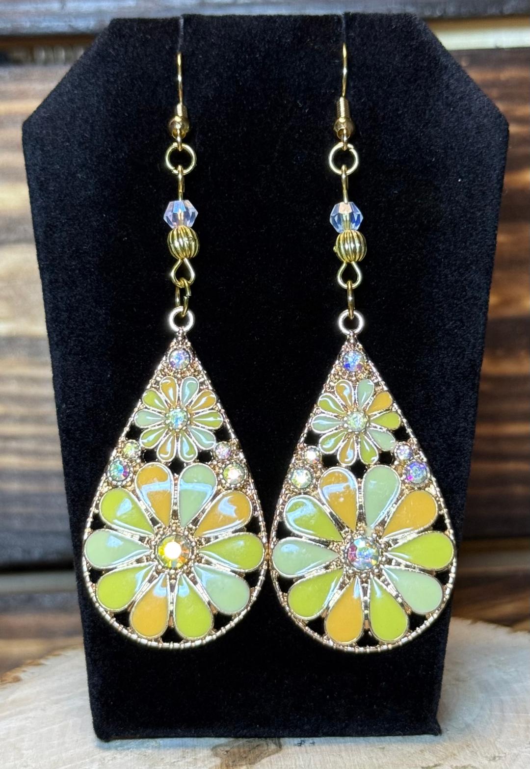 ![]() | Item #: 1006096 Click on image to see more pictures! Large gold tone teardrop earrings, decorated with enamel daisy flowers and iridescent rhinestones for a sparkling effect. Topped with a small gold tone barrel bead and a faceted white iridescent bead. Made with 18K gold plated, nickel free earring hooks. They are a bit heavy, very dramatic look. Measurement Questions? Price: 16.00 |