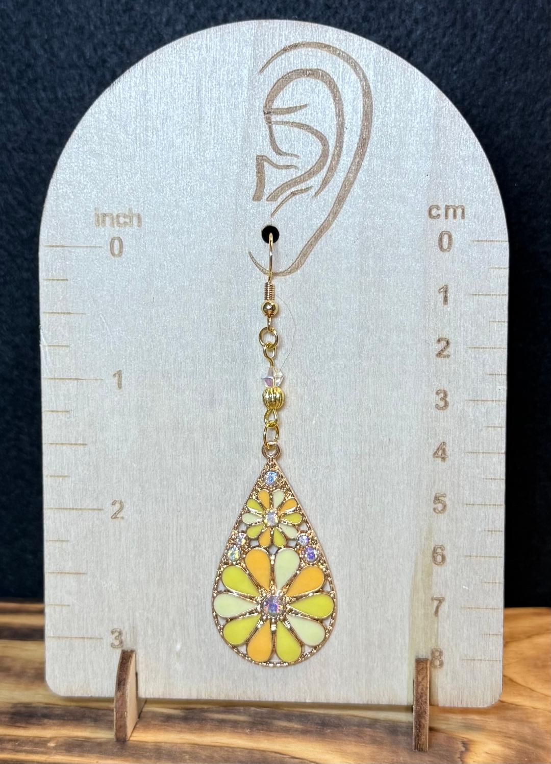 NEW DRAMATIC LARGE YELLOW FLORAL ENAMEL & RHINESTONE TEARDROP EARRINGS