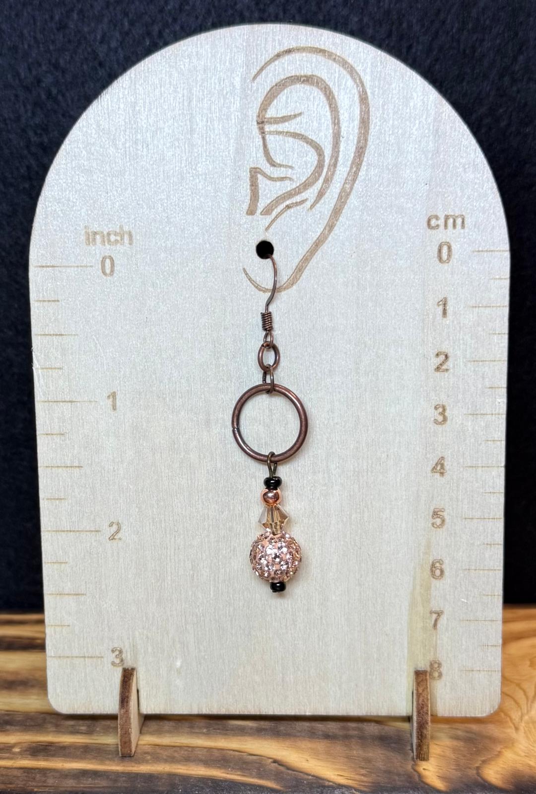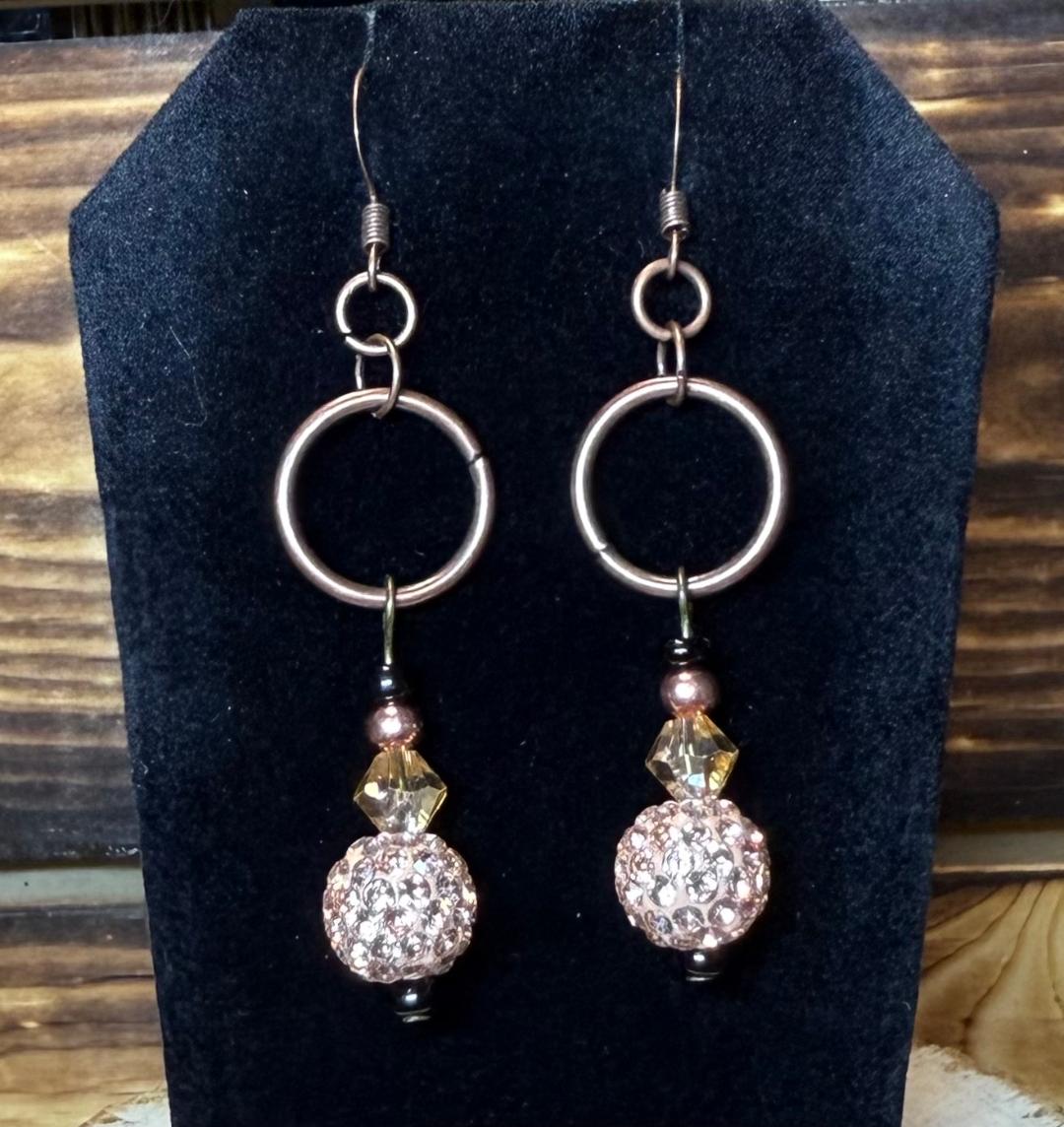 ![]() | Item #: 1006101 Click on image to see more pictures! A very sparkly pair of earrings with a rose gold color rhinestone ball charm, large bronze ring, faceted glass beads. Made with bronze, nickel free earring hooks. Measurement Questions? Price: 15.00 |