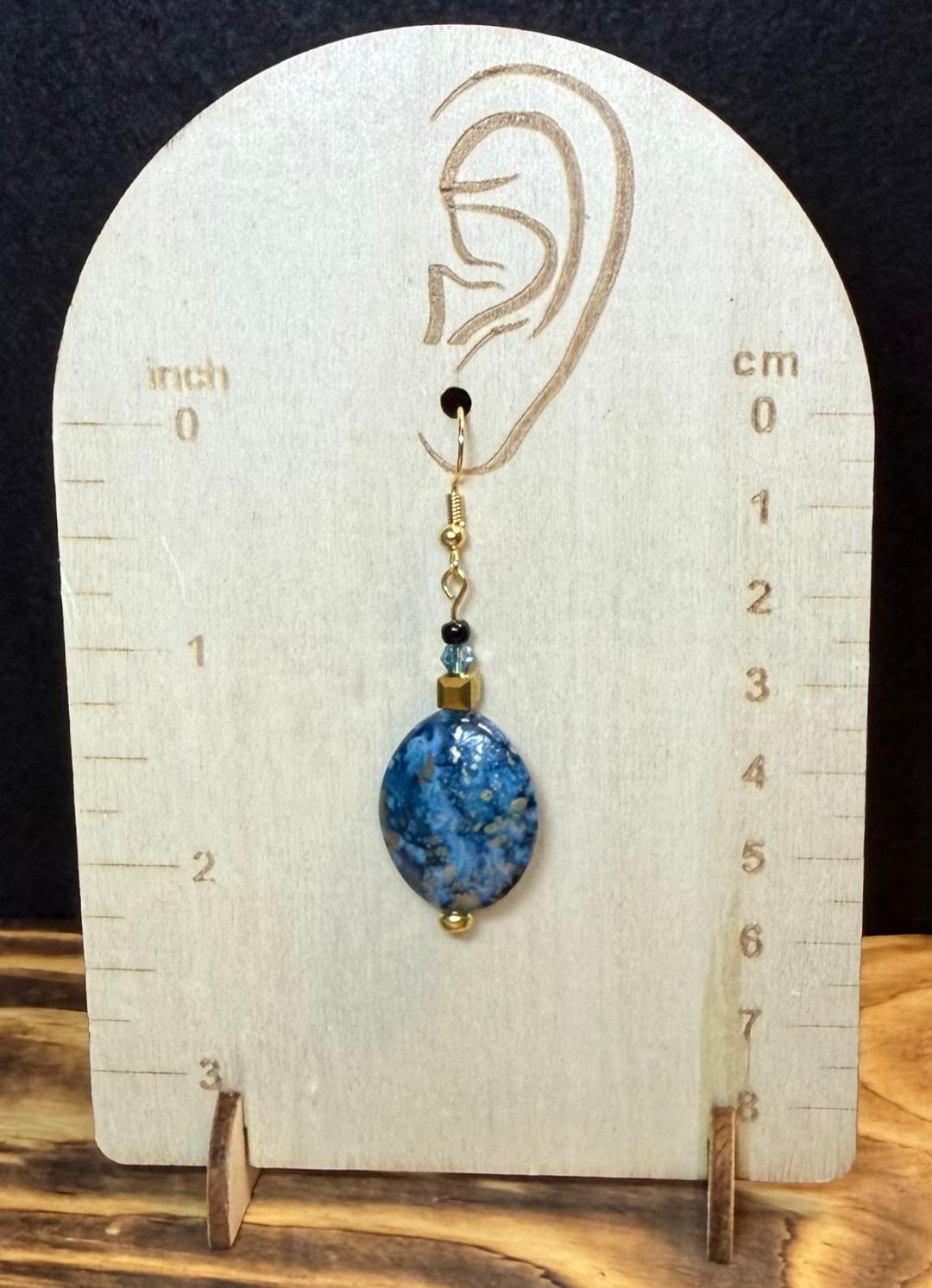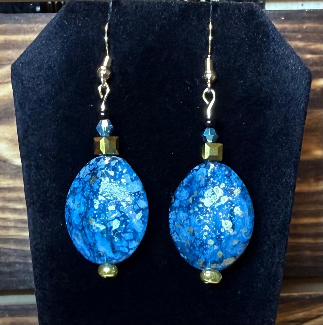 NEW OCEAN BLUE & GOLD OVAL CHARM EARRINGS W/ GLASS BEADS