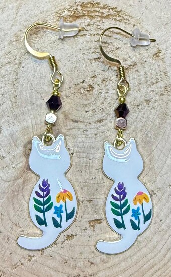 NEW WHITE & FLORAL ENAMEL CAT EARRINGS W/ DARK PURPLE & GOLD FACETED BEADS