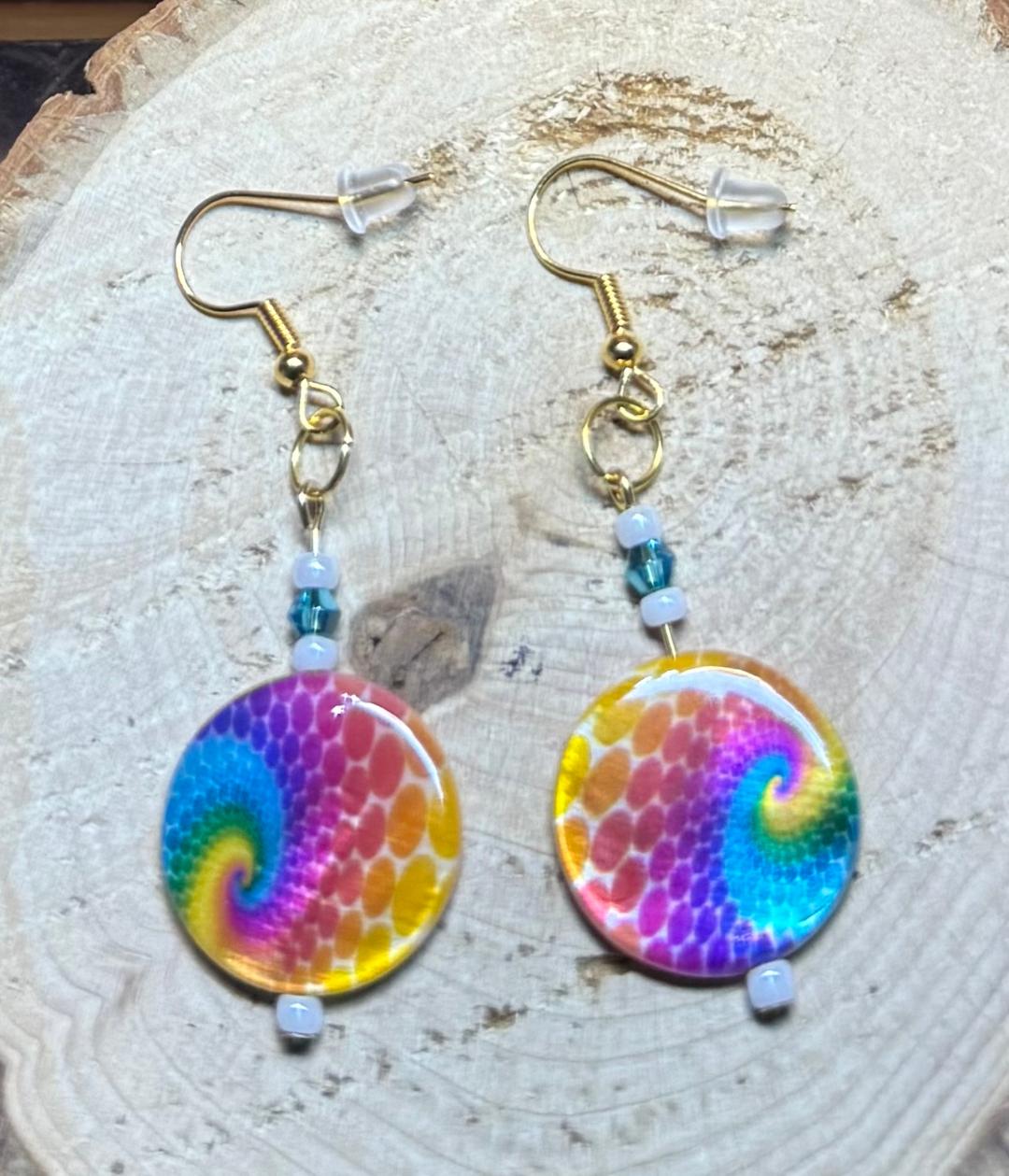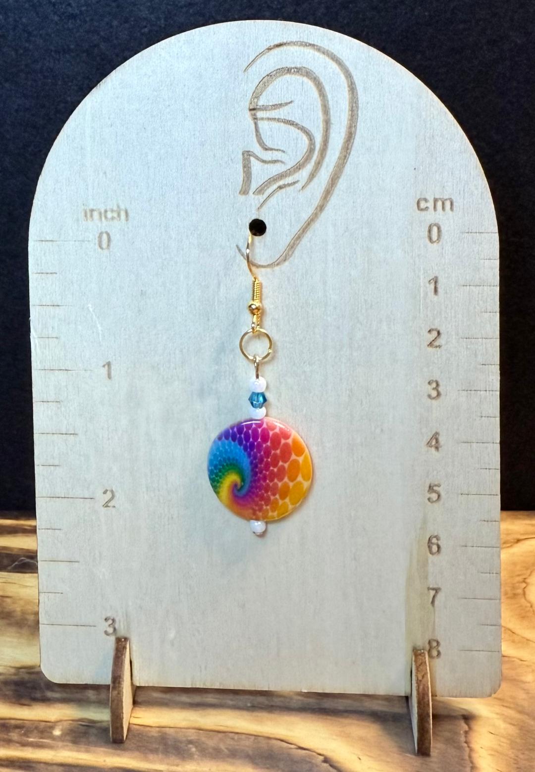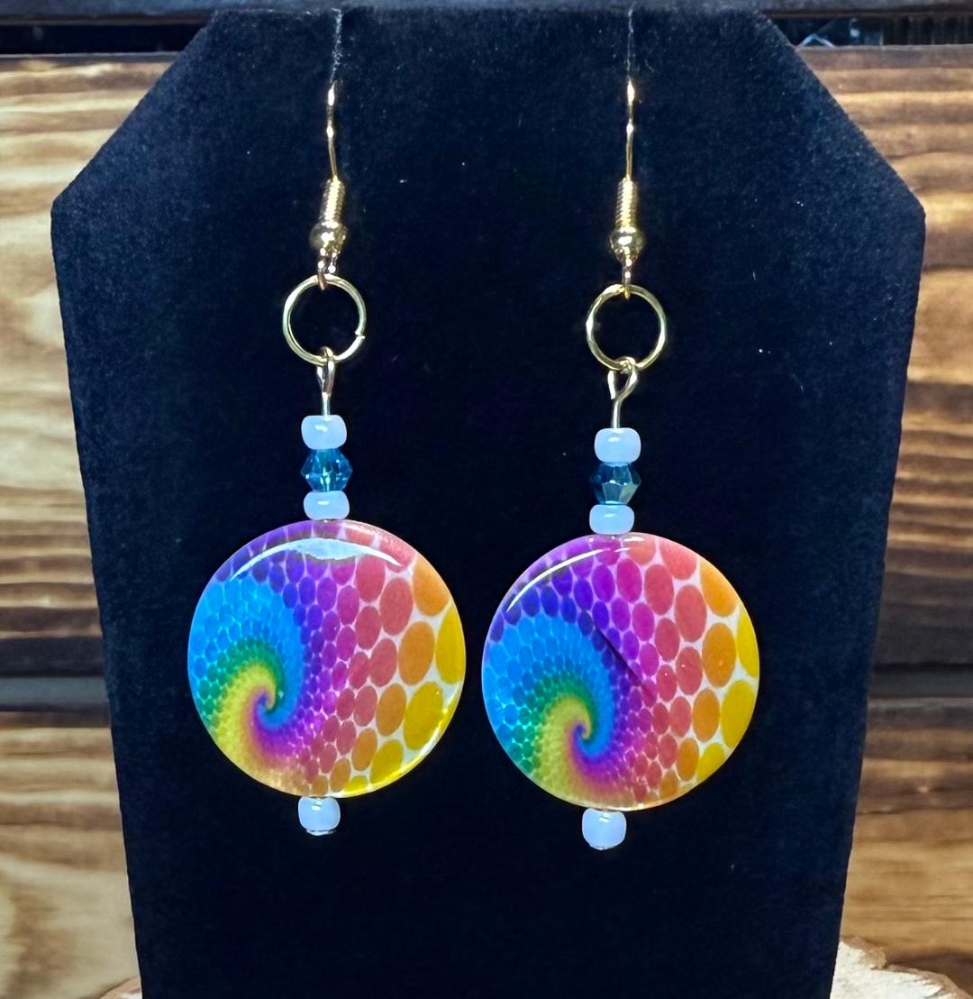 ![]() | Item #: 1006115 Click on image to see more pictures! A fun, hippie boho style pair of earrings in a tie dye swirl of rainbow colors. Topped with a faceted glass teal bead, as well as little white seed beads. Made with nickel free earring hooks. Measurement Questions? Price: 17.00 |