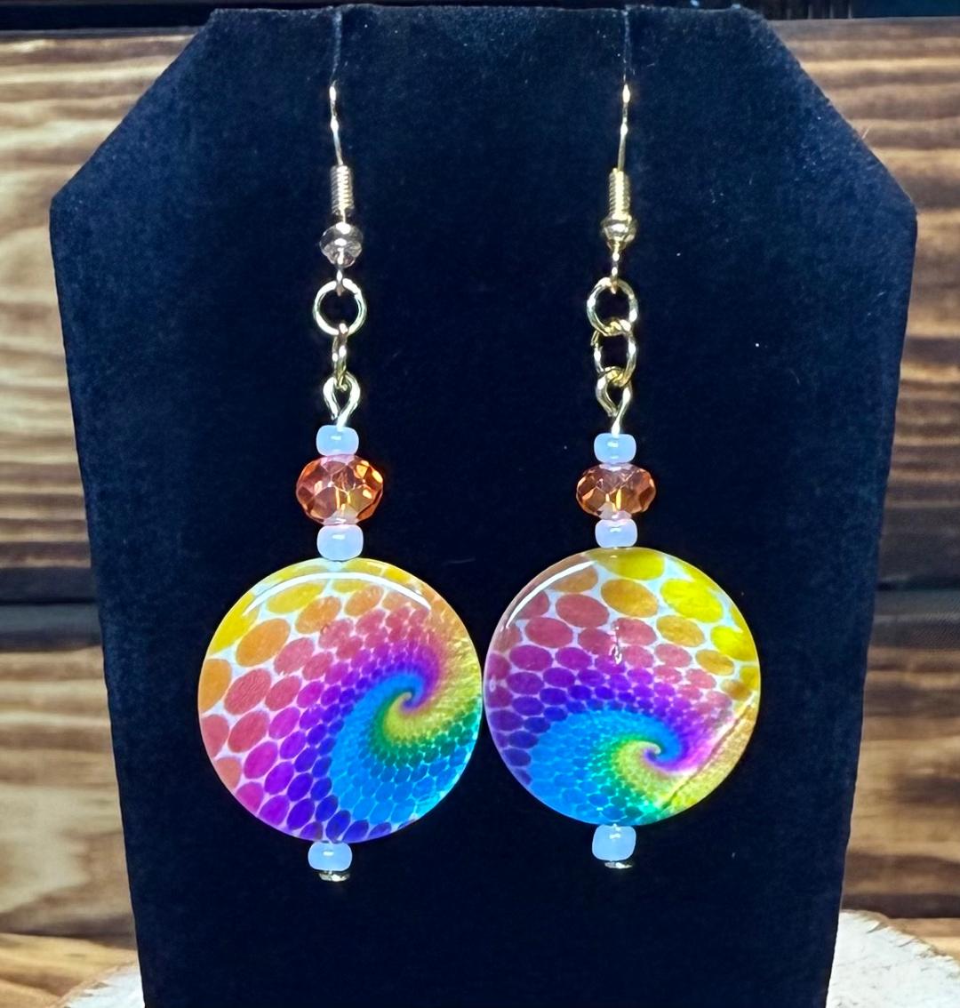 ![]() | Item #: 1006117 Click on image to see more pictures! A fun, hippie boho style pair of earrings in a tie dye swirl of rainbow colors. Topped with an faceted glass orange bead, as well as little white seed beads. Made with nickel free earring hooks. Measurement Questions? Price: 17.00 |