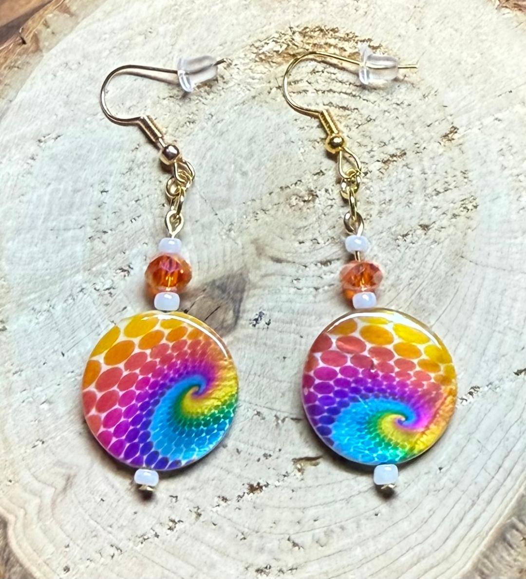 NEW ROUND HIPPIE TIE DYE COIN SHAPED EARRINGS W/ FACETED GLASS ORANGE BEADS