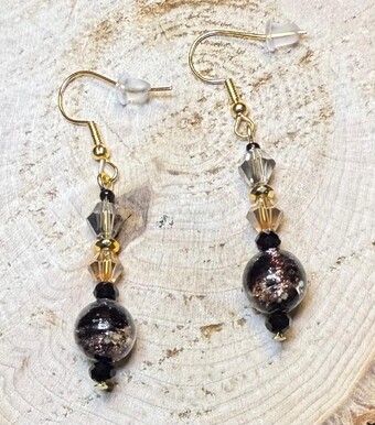 NEW ROUND BLACK & SPARKLING GOLD GLASS BEAD EARRINGS W/ FACETED BEADS
