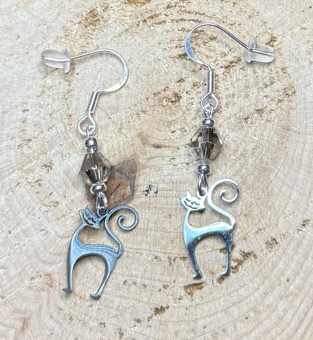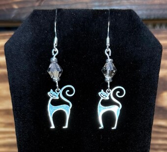 ![]() | Item #: 1006127 Click on image to see more pictures! Little smiling & sassy retro atomic cat charms, hollow cut stainless steel. They are topped with a grey plated glass faceted bead. Made with silver plated, nickel free earring hooks. Measurement Questions? Price: 19.00 |