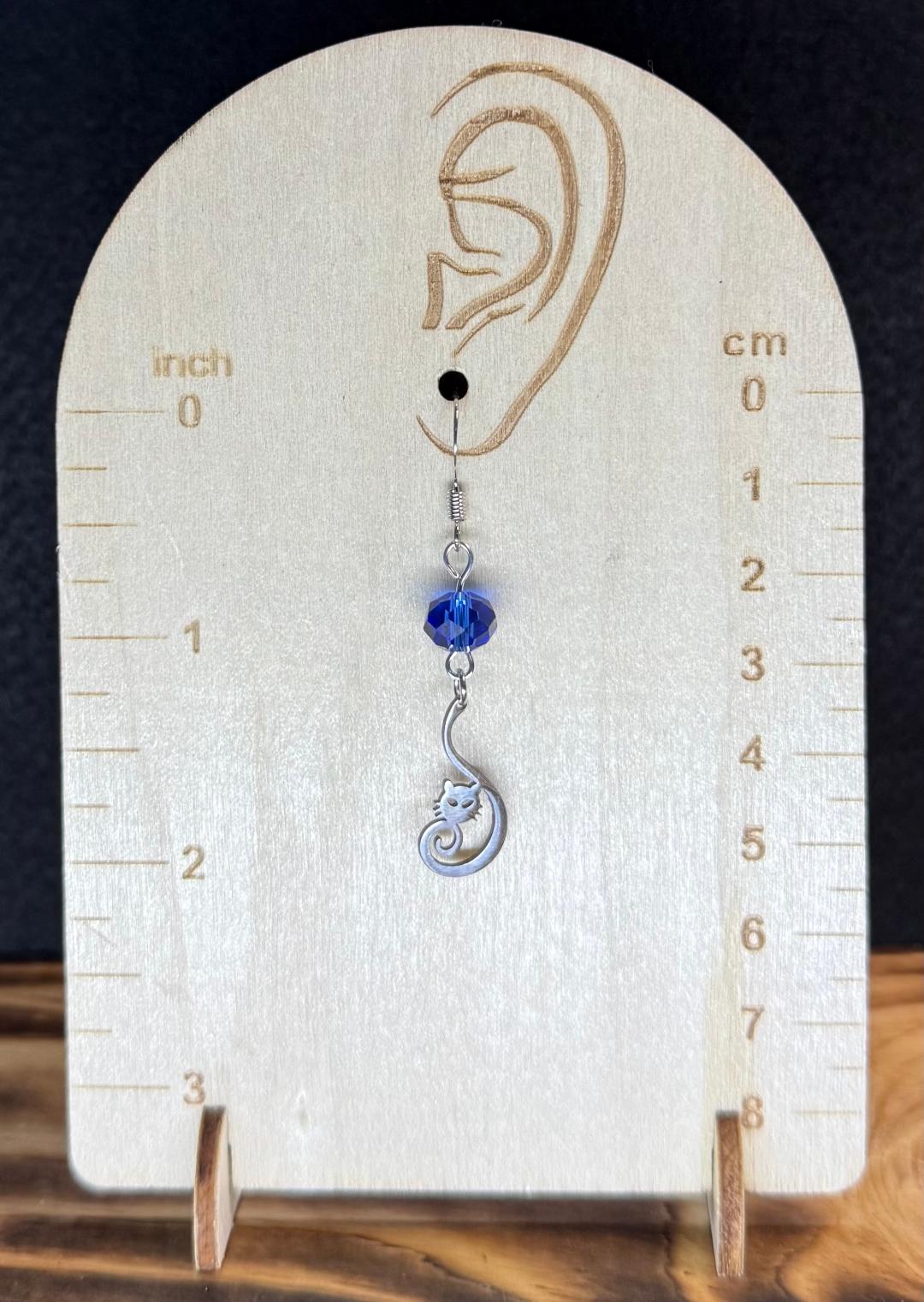 NEW CURLED TAIL STAINLESS STEEL CAT CHARM EARRING W/ BLUE GLASS FACETED BEADS