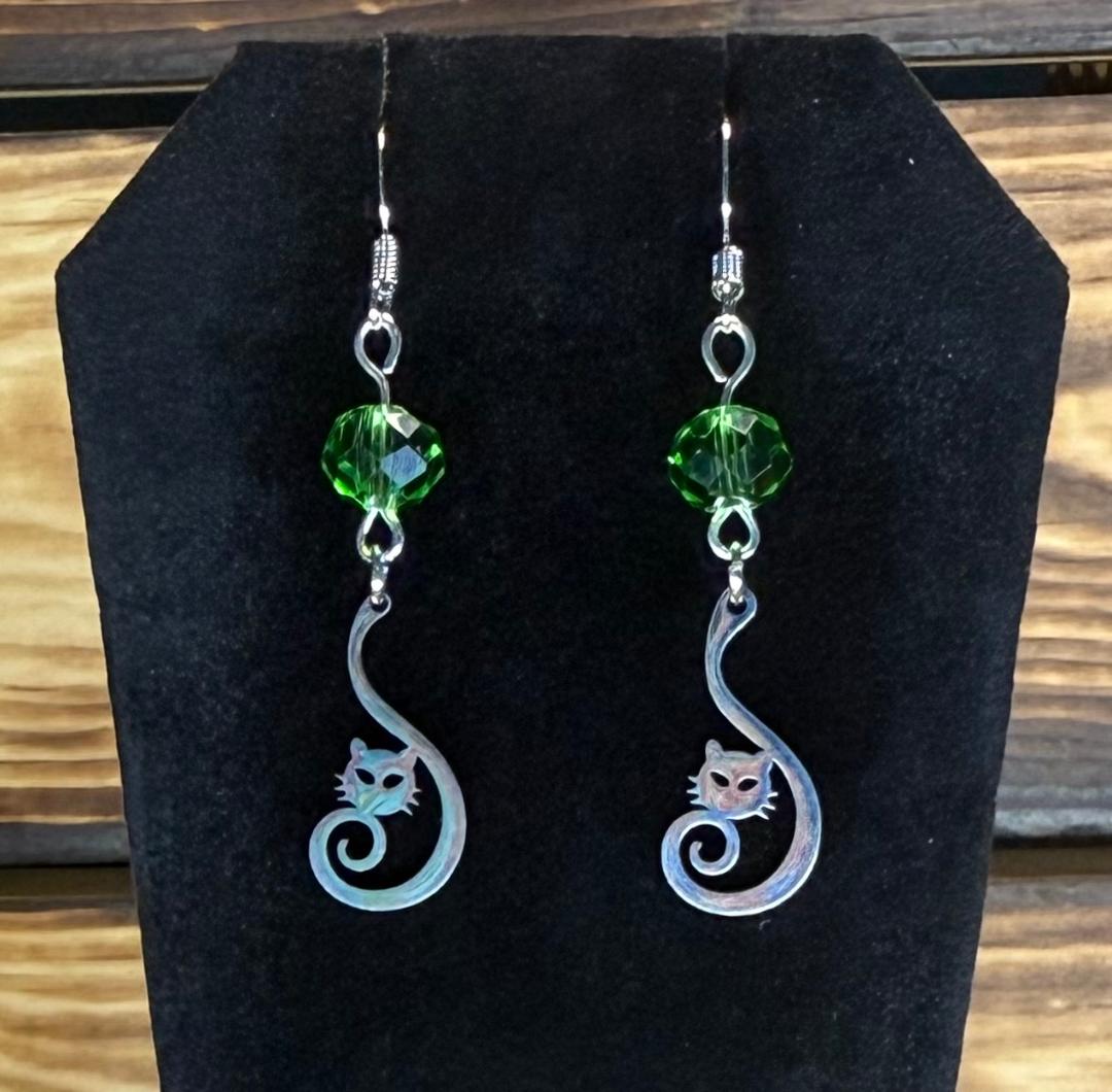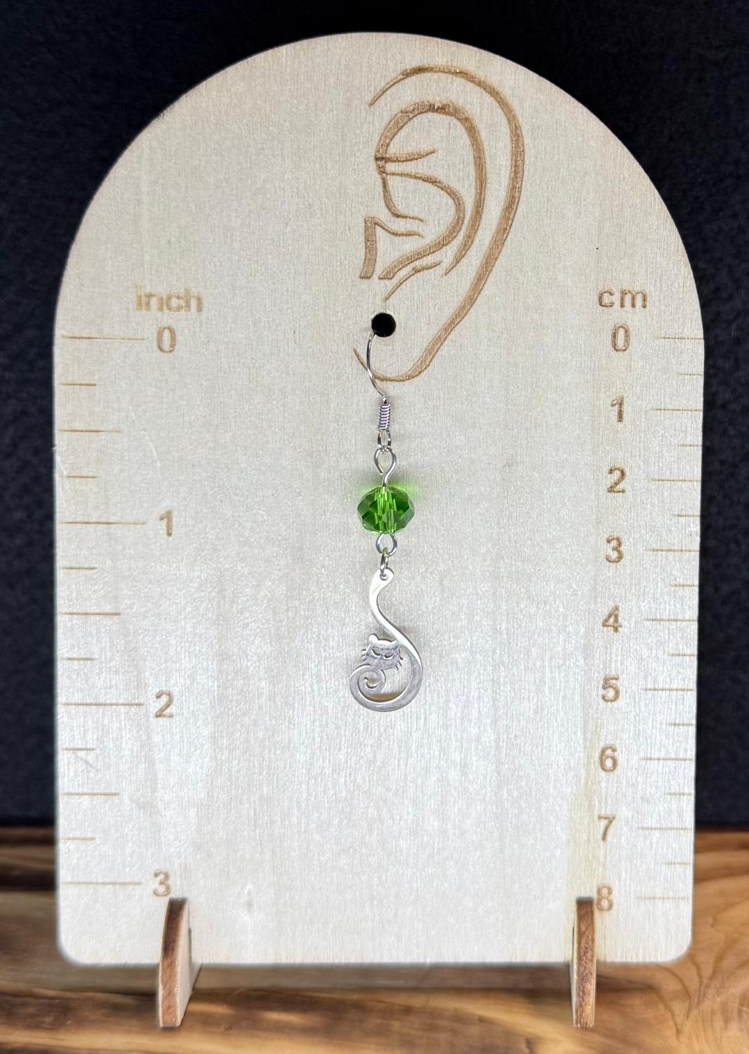 NEW CURLED TAIL STAINLESS STEEL CAT CHARM EARRING W/ GREEN GLASS FACETED BEADS