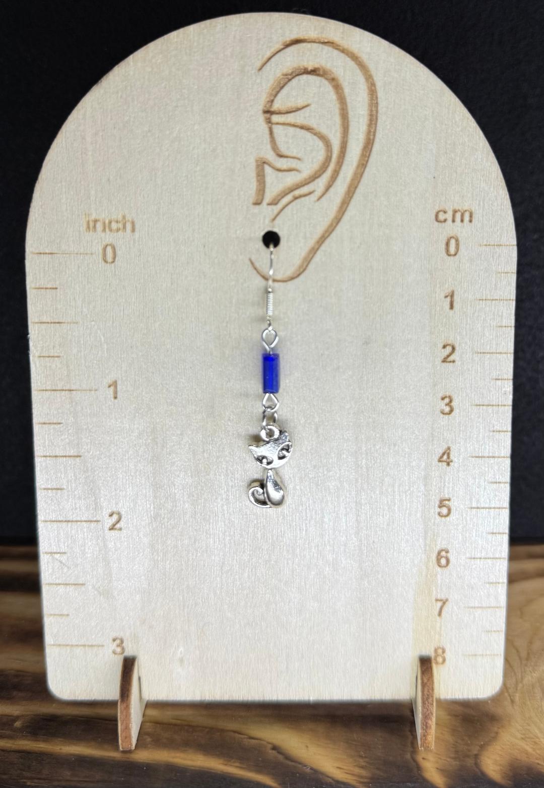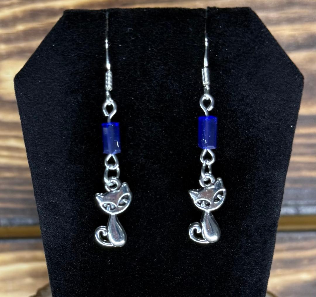 NEW SILVER TONE RETRO ATOMIC CAT EARRINGS W/ BLUE GLASS BEADS