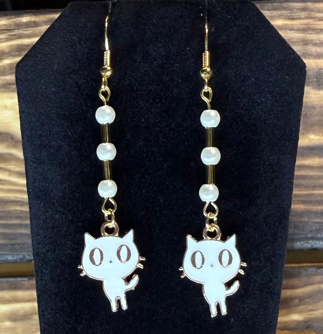 NEW WHITE ENAMEL ATOMIC CAT EARRINGS W/ FAUX PEARLS