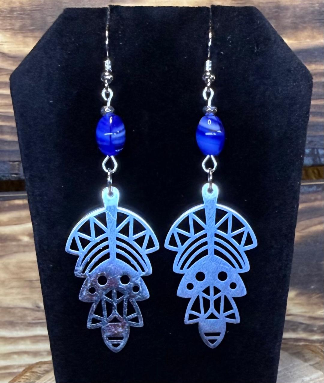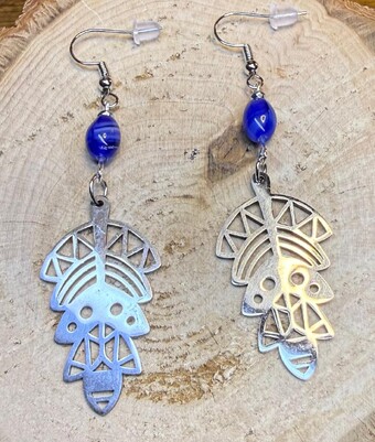![]() | Item #: 1006161 Click on image to see more pictures! An Aztec or Southwestern style symbol shape in stainless steel, topped with a royal blue marbled oval shaped bead. Made with nickel free earring hooks. Measurement Questions? Price: 18.00 |