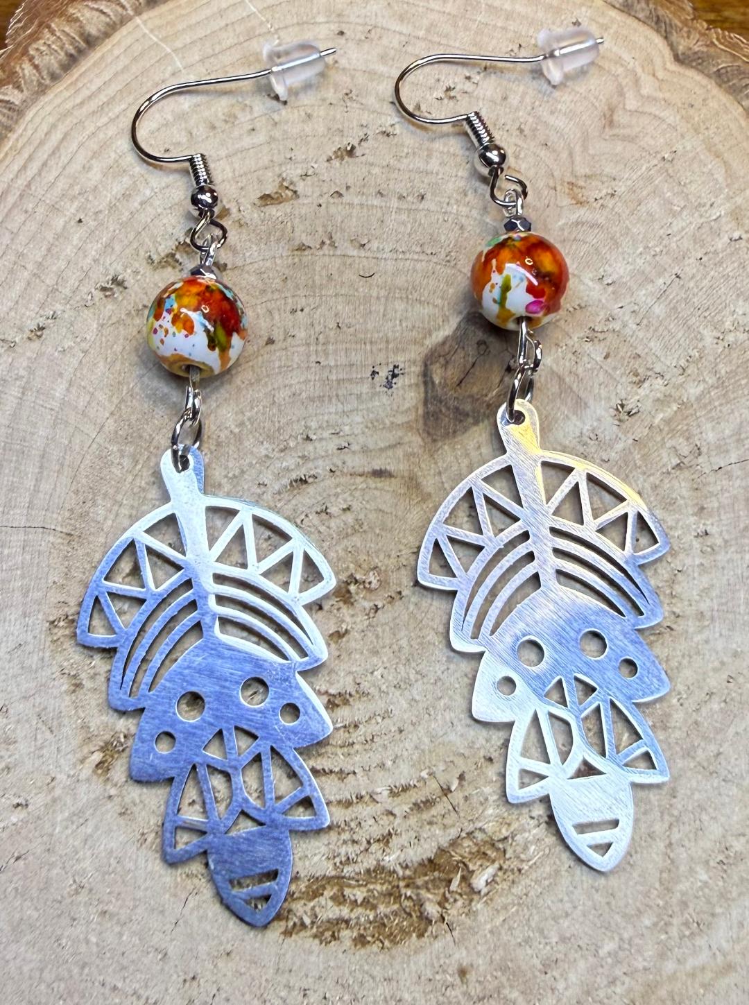 ![]() | Item #: 1006162 Click on image to see more pictures! An Aztec or Southwestern style symbol shape in stainless steel, topped with a multicolored round bead. Made with nickel free earring hooks. Measurement Questions? Price: 18.00 |