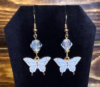 NEW WHITE ENAMEL BUTTERFLY EARRINGS W/ CLEAR FACETED BEADS