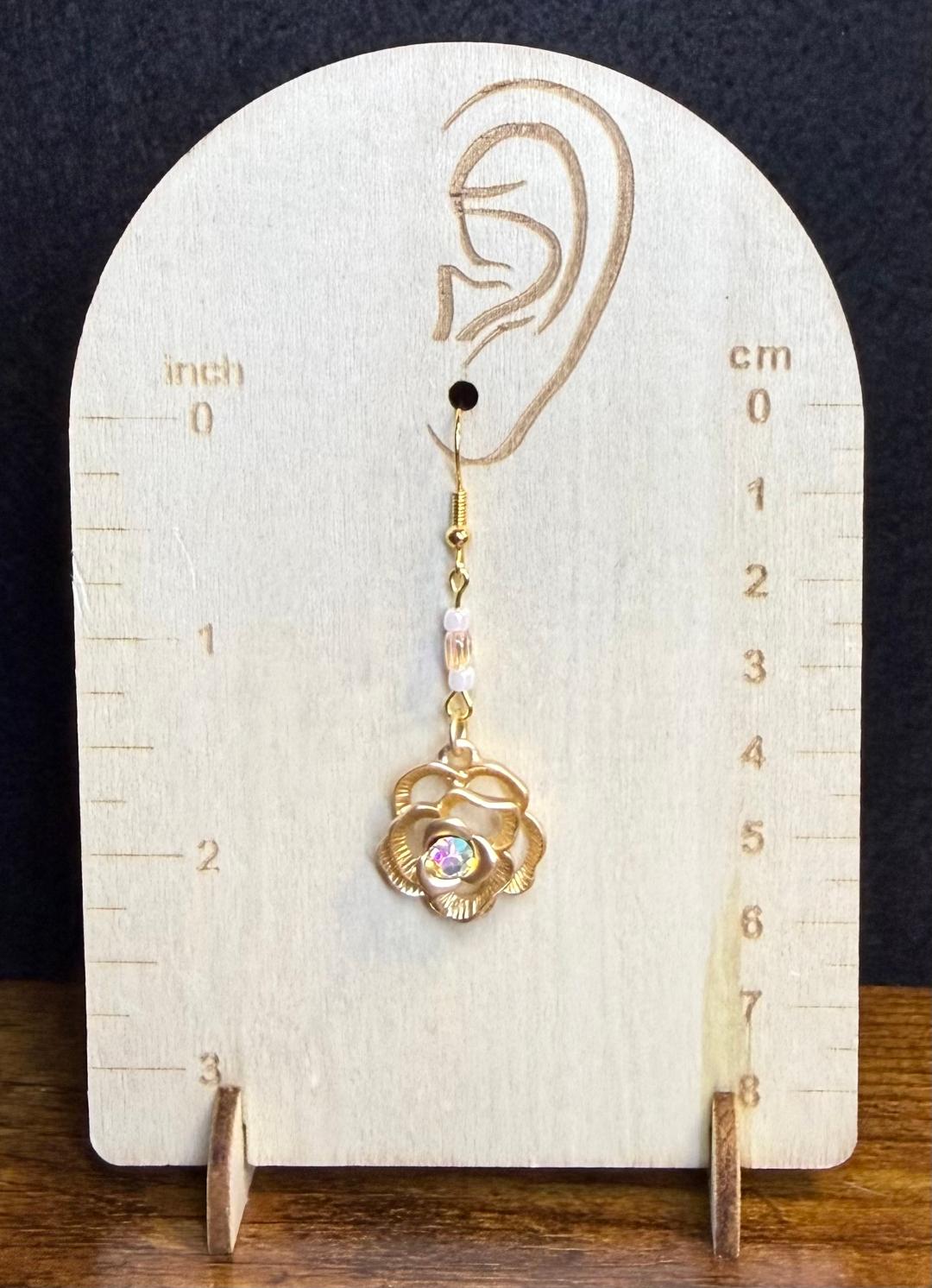 NEW GOLD ROSE CHARM EARRINGS W/ IRIDESCENT RHINESTONES & BEADS