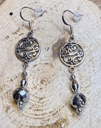 ![]() | Item #: 1006172 Click on image to see more pictures! Made to go with any outfit, a silver charm with swirled center, faceted glass mirrored silver bead at the bottom. Made with nickel free earring hooks. Measurement Questions? Price: 14.00 |