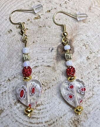 ![]() | Item #: 1006178 Click on image to see more pictures! A cute glass heart charm decorated in red & white. Topped with white, gold and red rhinestone round beads. Made with gold plated, nickel free earring hooks. Measurement Questions? Price: 17.00 |