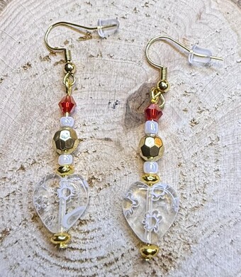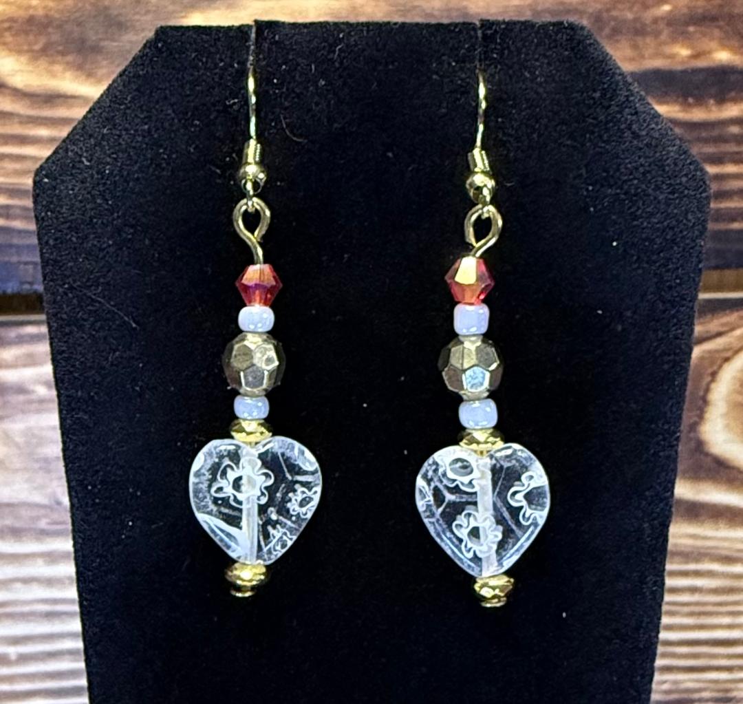 NEW GLASS HEART EARRINGS W/ RED & GOLD FACETED BEADS