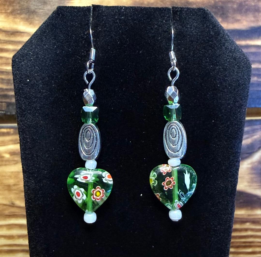 ![]() | Item #: 1006181 Click on image to see more pictures! A cute green glass heart charm decorated with various color flowers. Topped with a square glass faceted bead and silver faceted bead, as well as white seed beads and a silver swirl charm. Made with nickel free earring hooks. Measurement Questions? Price: 17.00 |