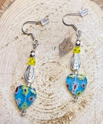 ![]() | Item #: 1006182 Click on image to see more pictures! A cute teal glass heart charm decorated with various color flowers. Topped with a faceted yellow glass faceted bead and silver faceted bead, as well as a silver swirl charm. Made with nickel free earring hooks. Measurement Questions? Price: 17.00 |