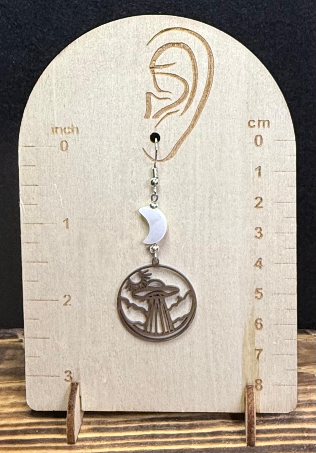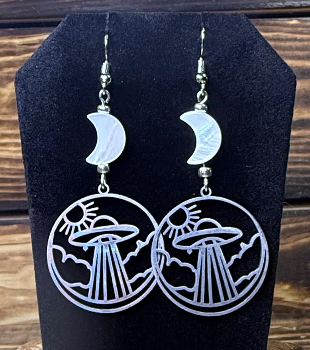 NEW SILVER STAINLESS STEEL SPACESHIP CHARM EARRINGS W/ WHITE SHELL MOONS