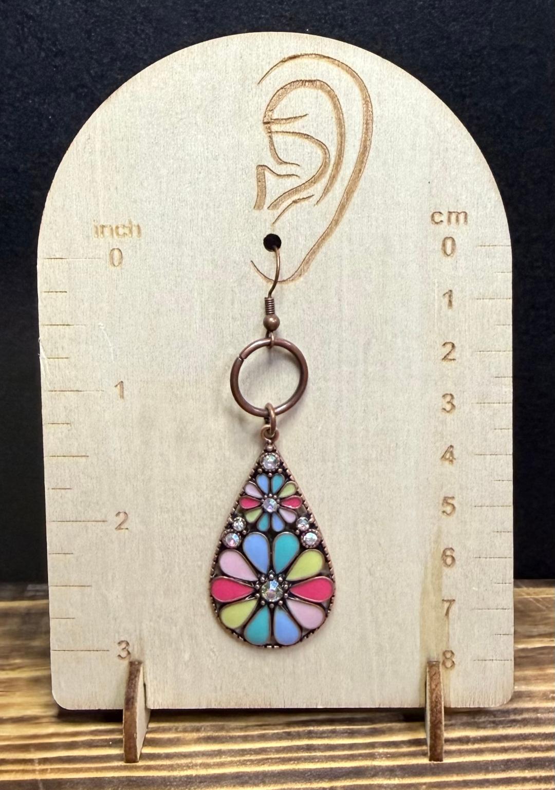 ![]() | Item #: 1006189 Click on image to see more pictures! Large antique copper red color teardrop earrings, decorated with multicolor enamel daisy flowers and iridescent rhinestones for a sparkling effect. Topped with a like color ring charm. They are a bit heavy, very dramatic look. Measurement Questions? Price: 16.00 |