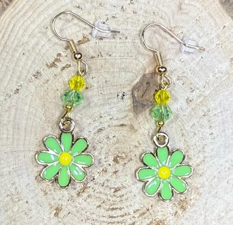 NEW VIBRANT GREEN DAISY CHARM EARRINGS W/ GLASS BEADS
