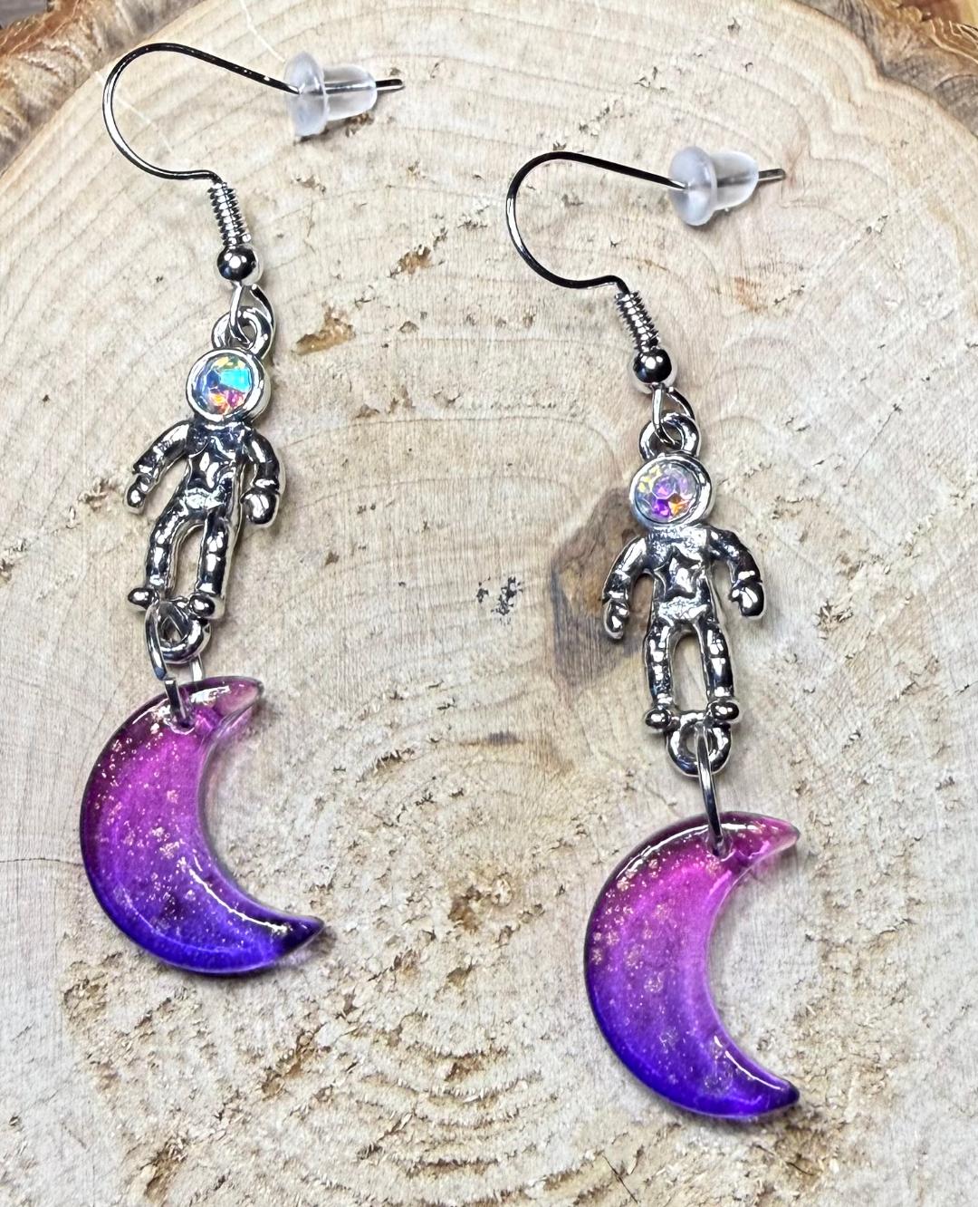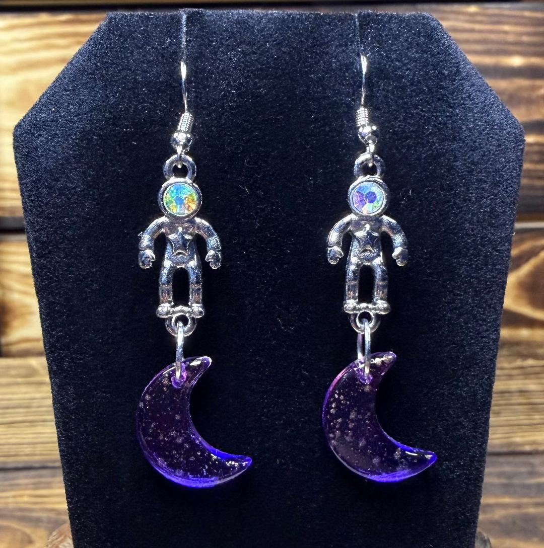 NEW MAN ON THE MOON ASTRONAUT EARRINGS W/ PURPLE MOON
