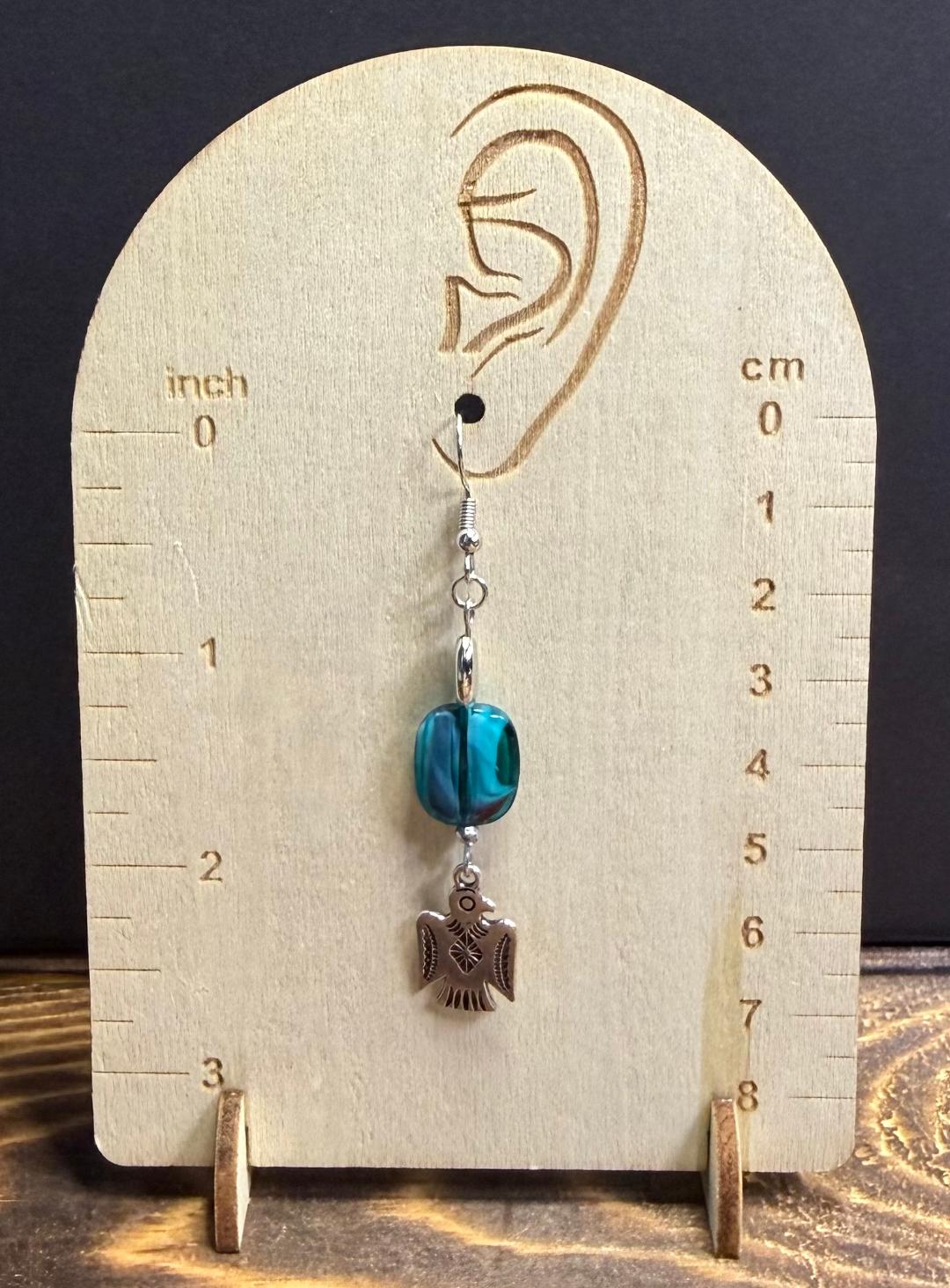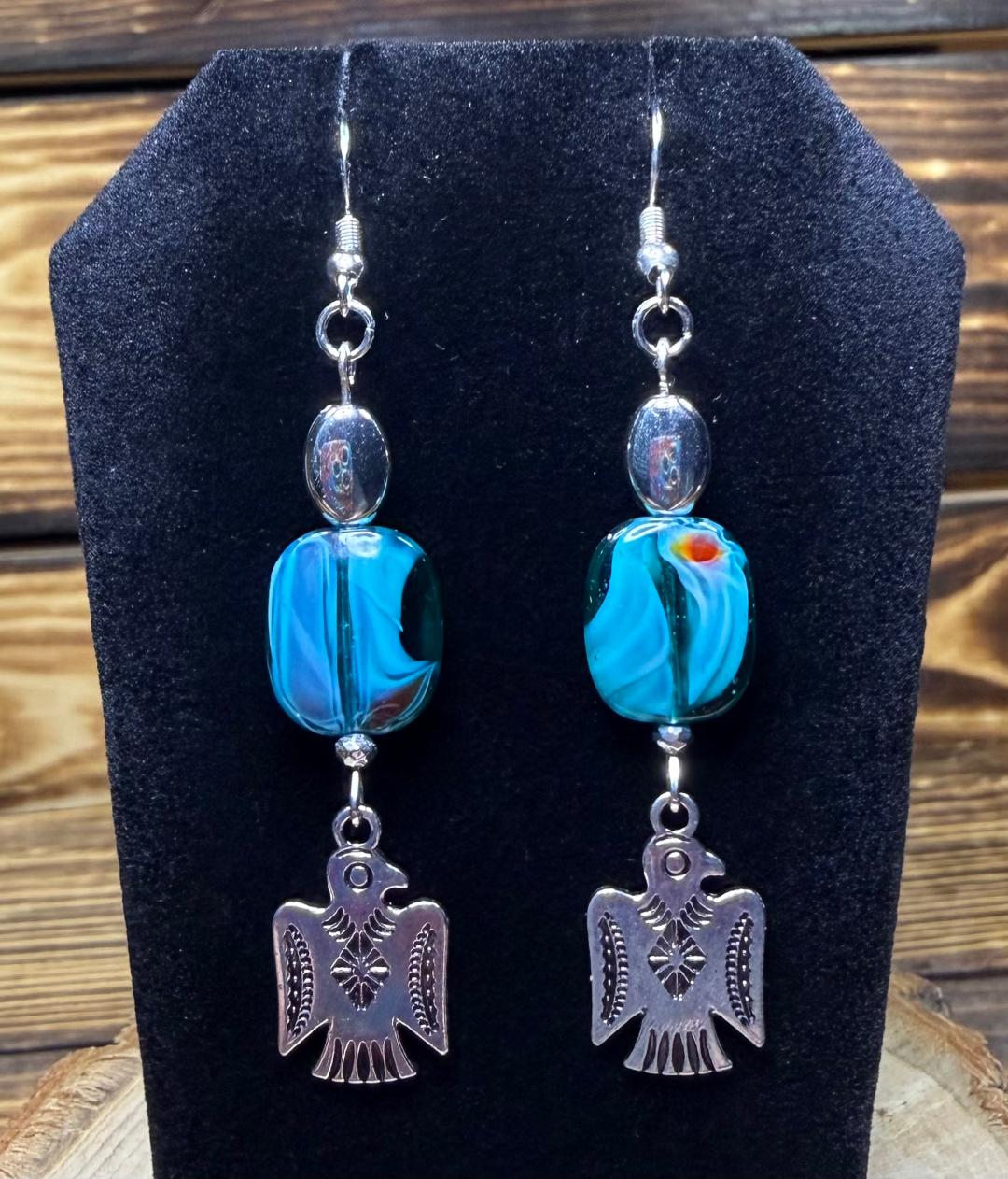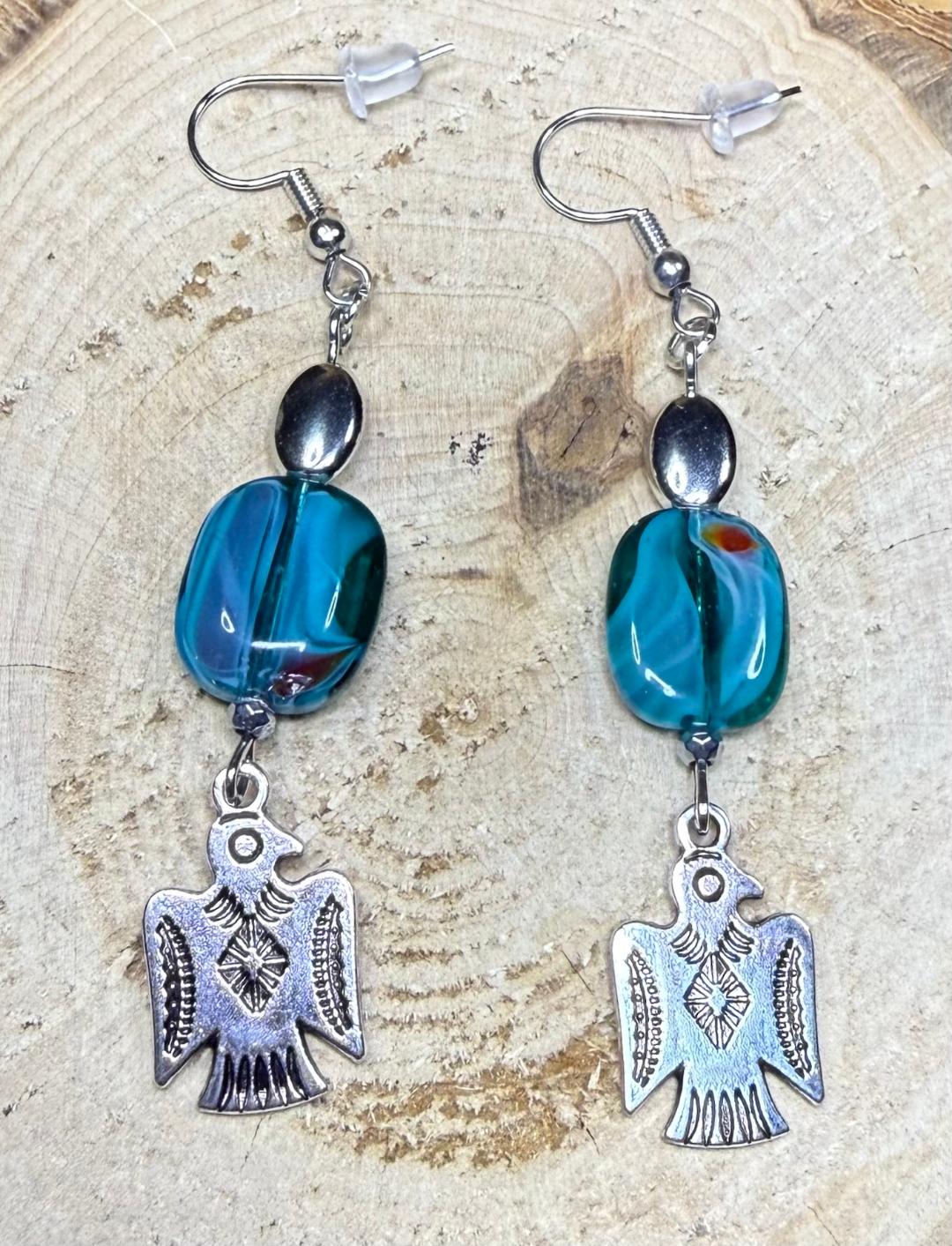 NEW DOUBLE SIDED THUNDERBIRD CHARM EARRINGS W/ TEAL SWIRL GLASS BEADS