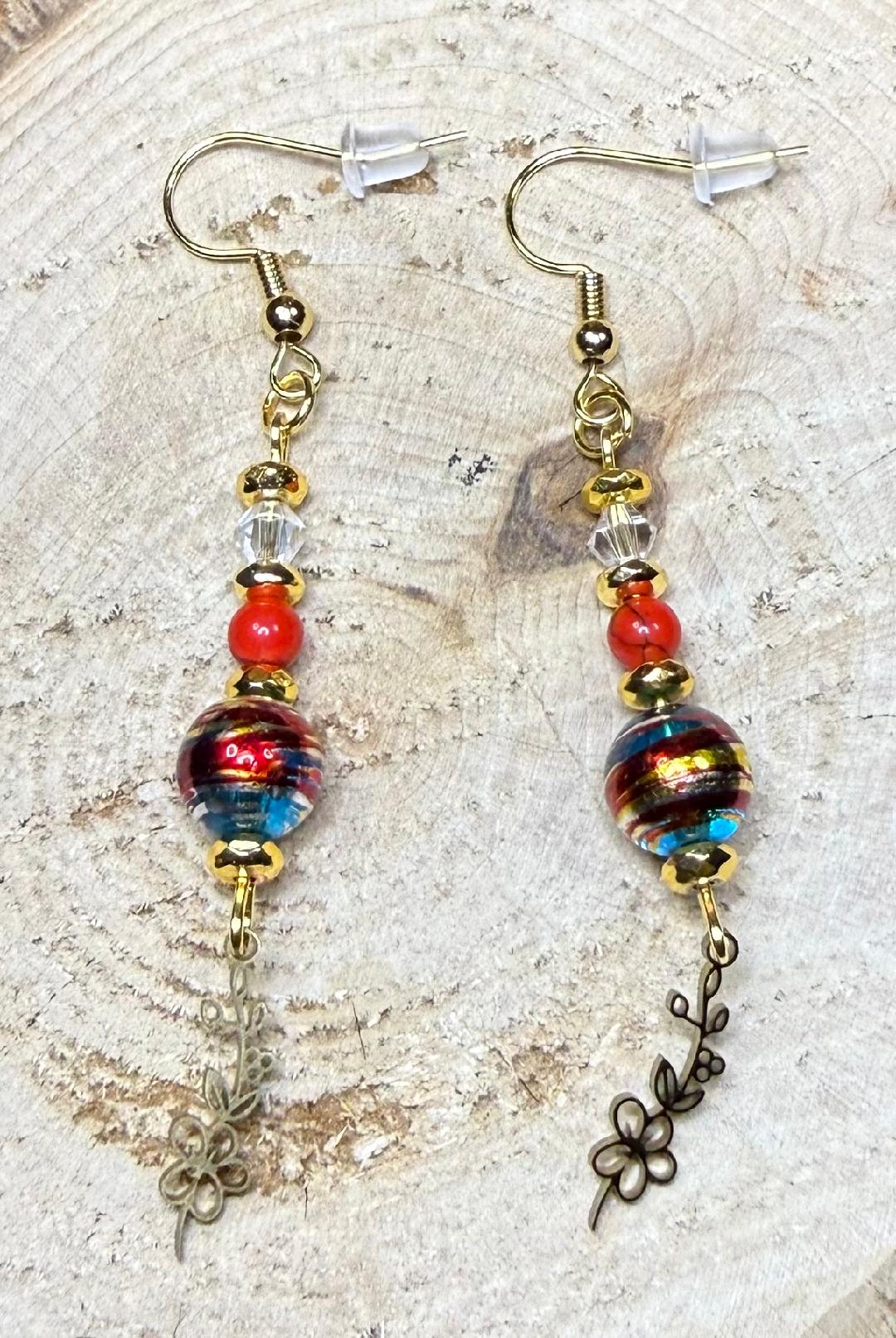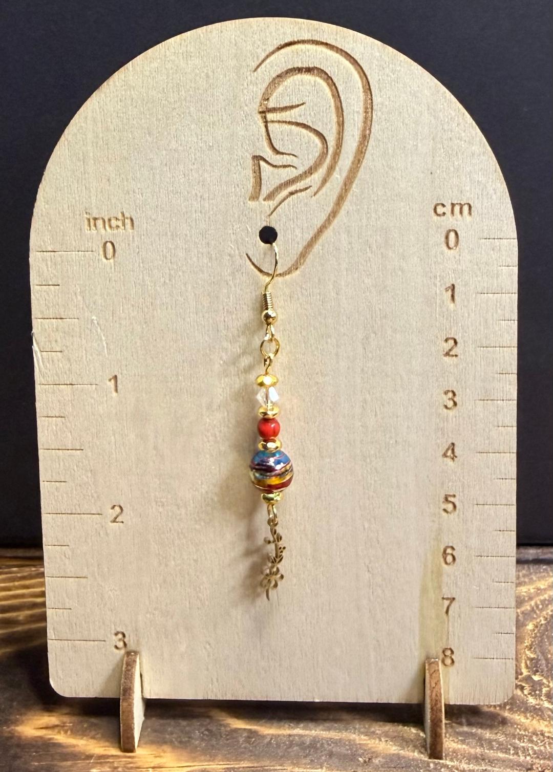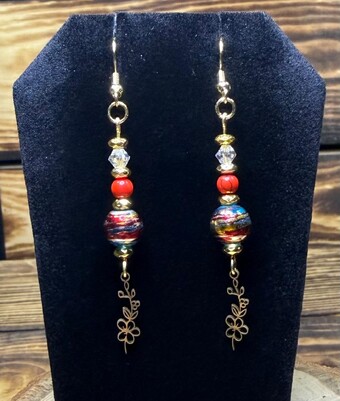 ![]() | Item #: 1006215 Click on image to see more pictures! A unique pair of earrings with a petite gold stainless steel flower vine, topped with a multicolored round plated glass confetti bead, as well as a clear glass faceted bead, vibrant red bead and gold hematite seed bead.Made with 18K gold plated, nickel free earring hooks. Measurement Questions? Price: 19.00 |