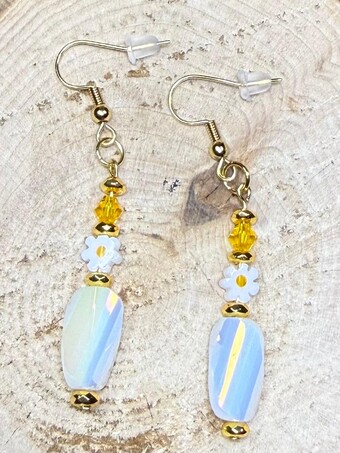 ![]() | Item #: 1006216 Click on image to see more pictures! Very unique with the focus on a tiny daisy charm, along with a large white pearlized oval glass bead. There are also yellow glass faceted beads and gold faceted hematite seed beads. The bead pin is 18K gold plated. Made with 18K gold plated, nickel free earring hooks. Measurement Questions? Price: 20.00 |