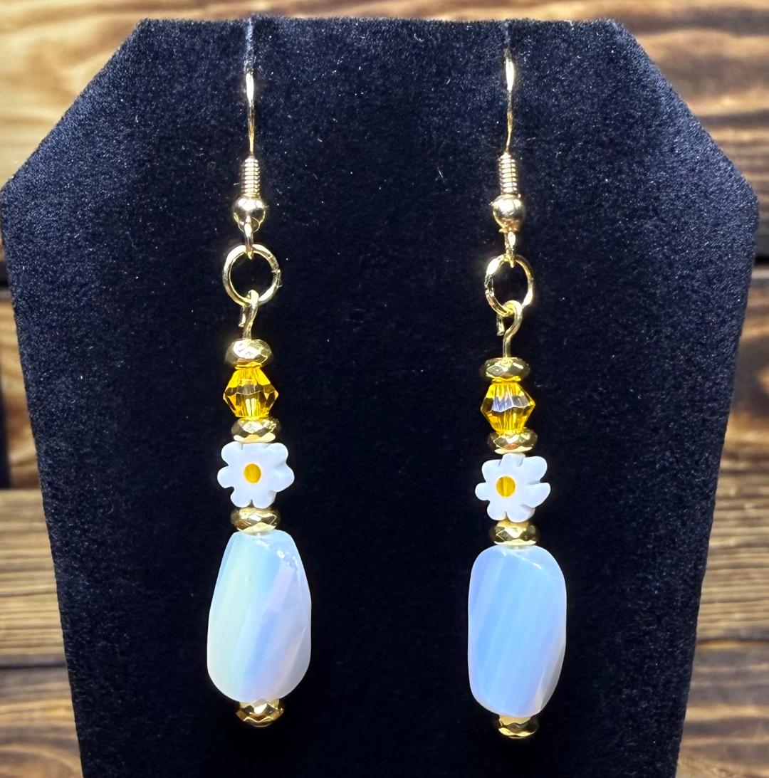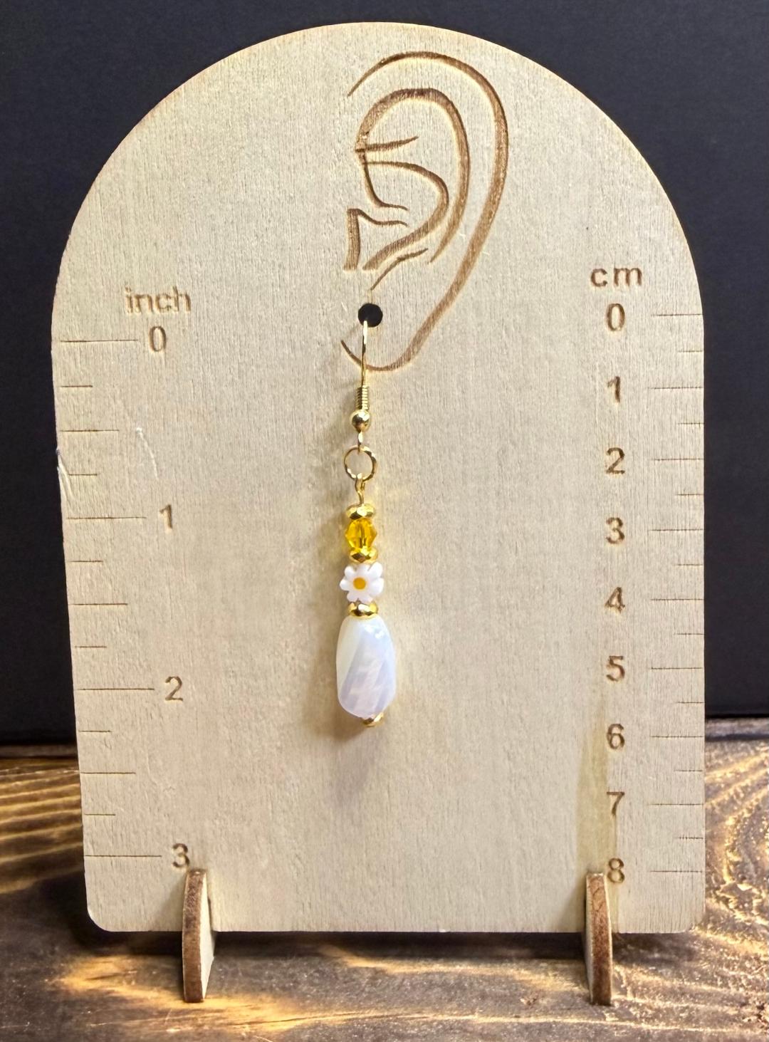 NEW TINY DAISY CHARM EARRINGS W/ LARGE WHITE PEARLIZED GLASS BEADS