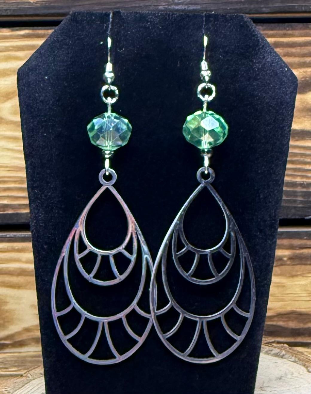 NEW DRAMATIC STAINLESS STEEL LARGE TEARDROP EARRINGS W/ GREEN GLASS BEADS