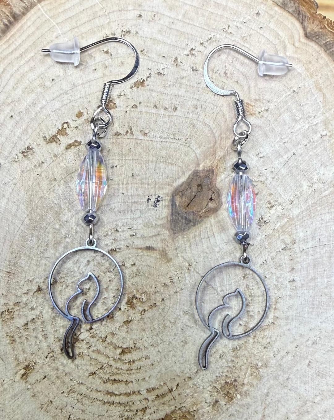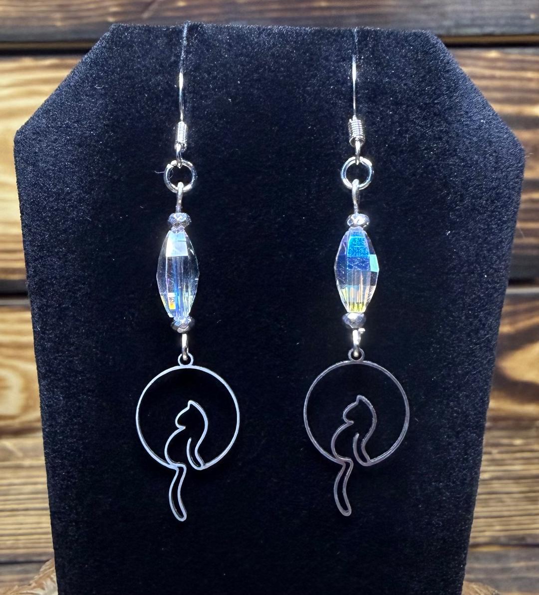 NEW SILVER DANGLING TAIL CAT EARRINGS W/ GLASS BEADS