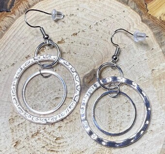 ![]() | Item #: 1006236 Click on image to see more pictures! A basic, yet attractive pair of triple hoop silver color metal alloy earrings. A photo is included that shows how the hoops hang, very cute. Three sizes, with the top being the smallest and the largest being hammered metal. Made with nickel free earring hooks. Measurement Questions? Price: 12.00 |