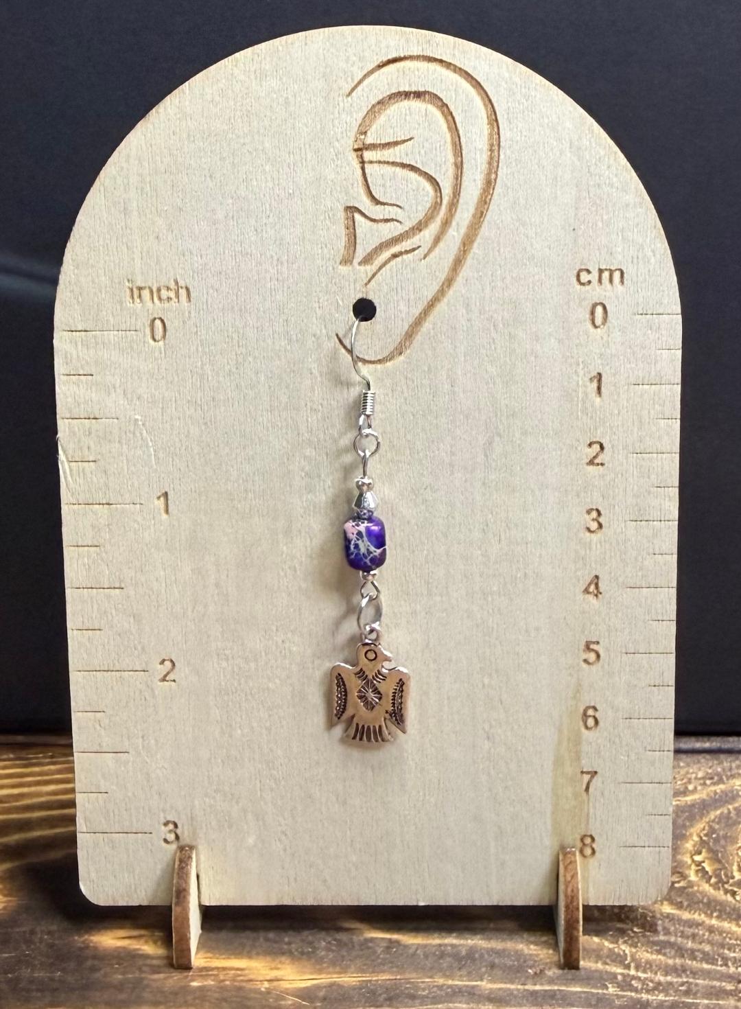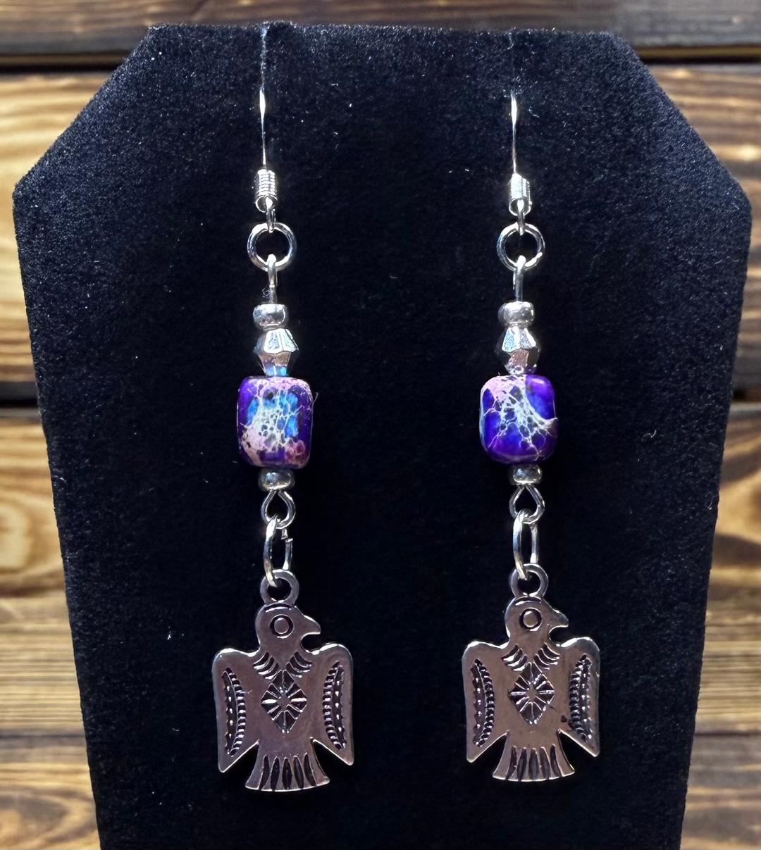 ![]() | Item #: 1006237 Click on image to see more pictures! A wonderful Southwestern style pair of earrings with a silver etched metal alloy thunderbird charm. They are topped with a purple dyed Imperial Jasper bead that has a crackle finish. Made with nickel free earring hooks. Measurement Questions? Price: 17.00 |